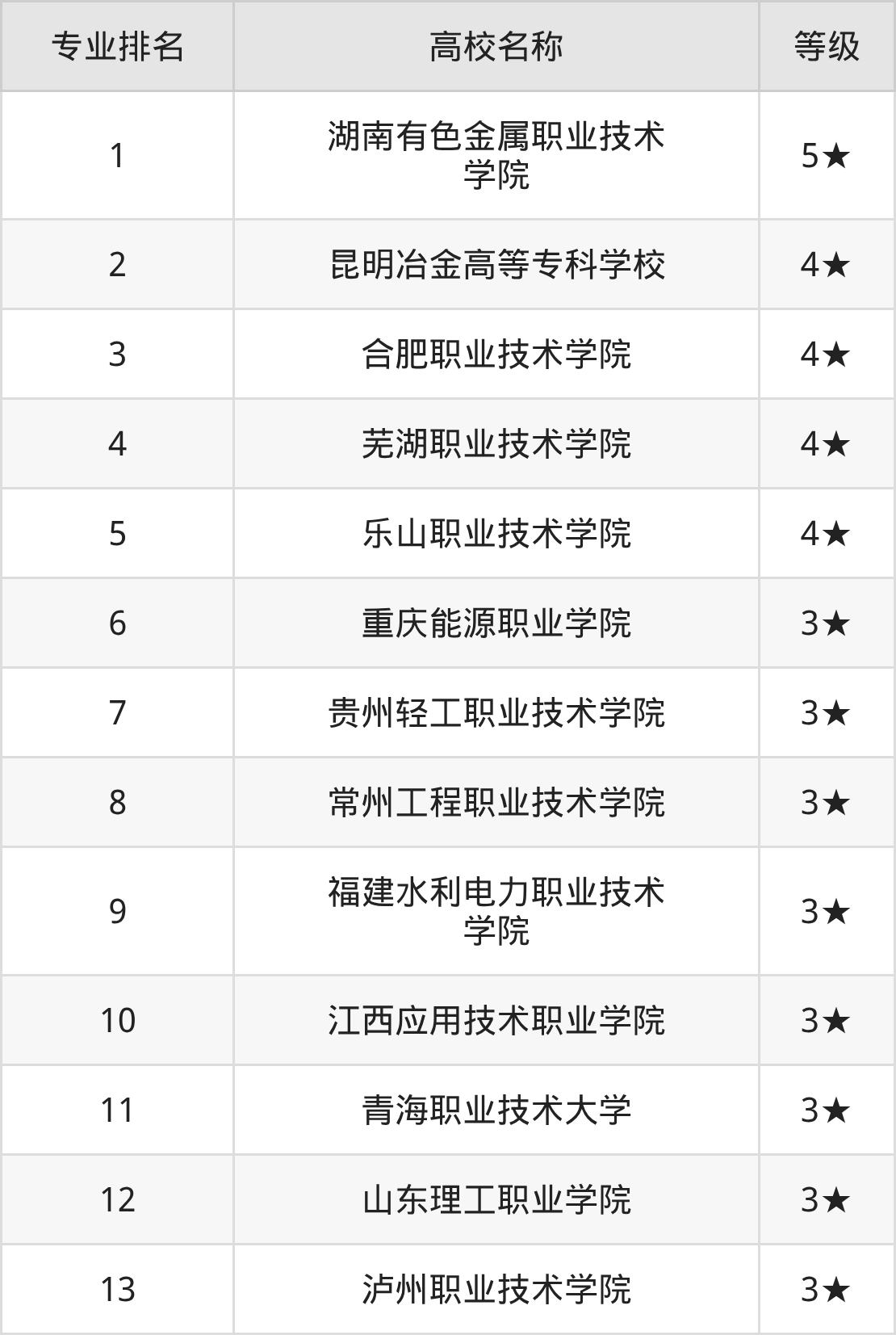 全國(guó)儲(chǔ)能材料技術(shù)開設(shè)院校參與排名的共有13所,實(shí)力最強(qiáng)的是湖南有色金屬職業(yè)技術(shù)學(xué)院(全國(guó)排名第1名),其專業(yè)實(shí)力等級(jí)被評(píng)為5★級(jí)。