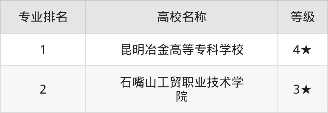 全國炭材料工程技術(shù)開設(shè)院校參與排名的共有2所,實(shí)力最強(qiáng)的是昆明冶金高等??茖W(xué)校(全國排名第1名),其專業(yè)實(shí)力等級(jí)被評(píng)為4★級(jí)。