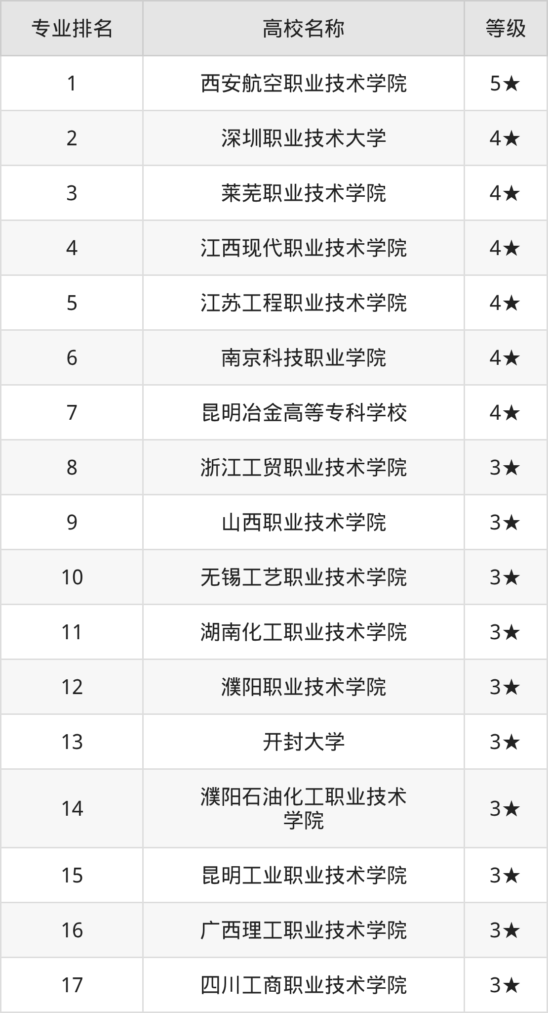 全國(guó)材料工程技術(shù)開(kāi)設(shè)院校參與排名的共有17所,實(shí)力最強(qiáng)的是西安航空職業(yè)技術(shù)學(xué)院(全國(guó)排名第1名),其專業(yè)實(shí)力等級(jí)被評(píng)為5★級(jí)。