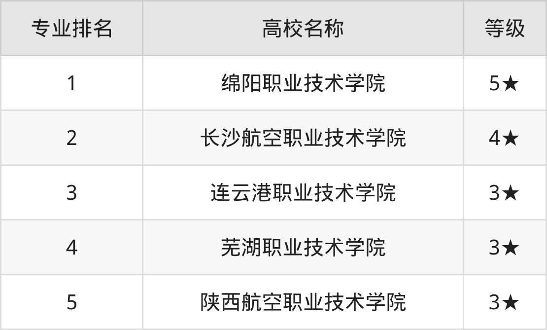 全國(guó)復(fù)合材料智能制造技術(shù)開(kāi)設(shè)院校參與排名的共有5所,實(shí)力最強(qiáng)的是綿陽(yáng)職業(yè)技術(shù)學(xué)院(全國(guó)排名第1名),其專業(yè)實(shí)力等級(jí)被評(píng)為5★級(jí)。