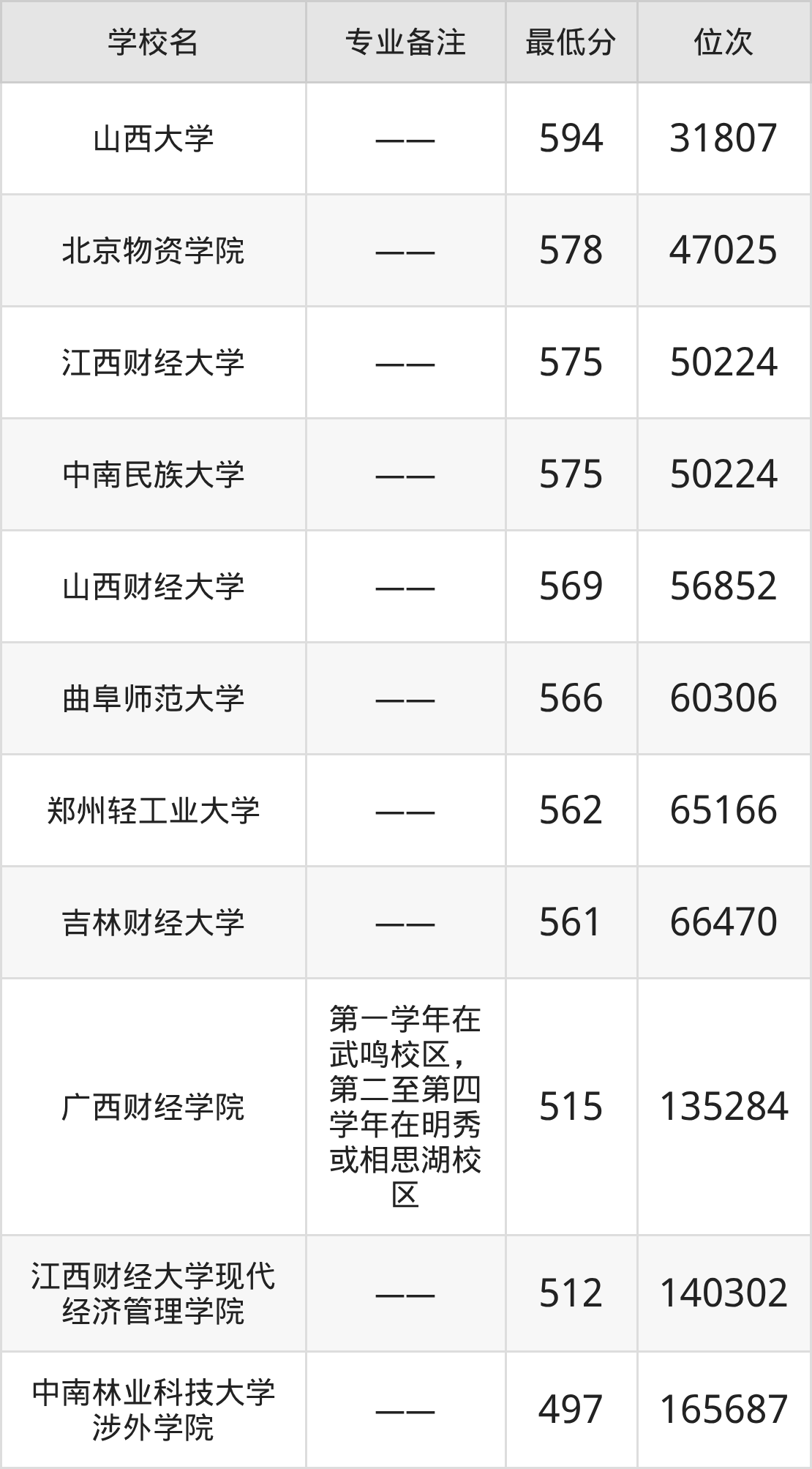 分?jǐn)?shù)線(xiàn)低于570分能上的數(shù)據(jù)科學(xué)大學(xué)還有鄭州輕工業(yè)大學(xué)(562分)、吉林財(cái)經(jīng)大學(xué)(561分)、廣西財(cái)經(jīng)學(xué)院(515分)、江西財(cái)經(jīng)大學(xué)現(xiàn)代經(jīng)濟(jì)管理學(xué)院(512分)。
