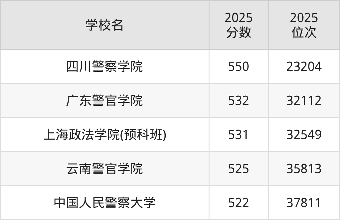 物理類520到550分的大學中分數(shù)對應位次最高的是四川警察學院,2025年最低分550分,對應最低位次是23204名;分數(shù)對應位次最低的是中國人民警察大學,2025年最低分522分,對應最低位次是37811名。
