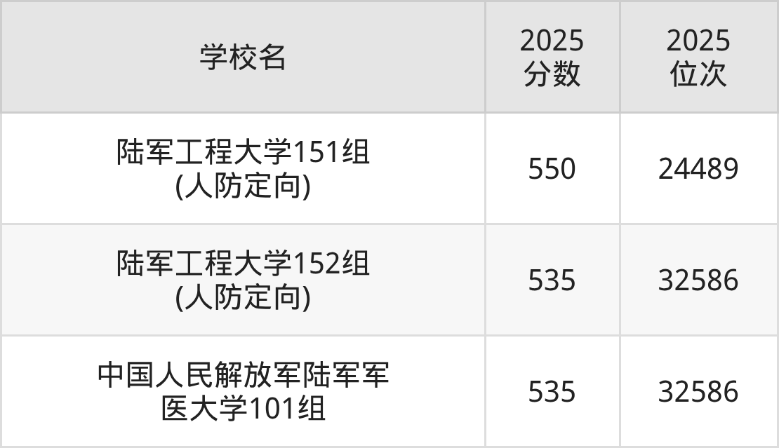 物理類520到550分的大學(xué)中分?jǐn)?shù)對應(yīng)位次最高的是陸軍工程大學(xué)151組(人防定向),2025年最低分550分,對應(yīng)最低位次是24489名;分?jǐn)?shù)對應(yīng)位次最低的是陸軍工程大學(xué)152組(人防定向),2025年最低分535分,對應(yīng)最低位次是32586名。