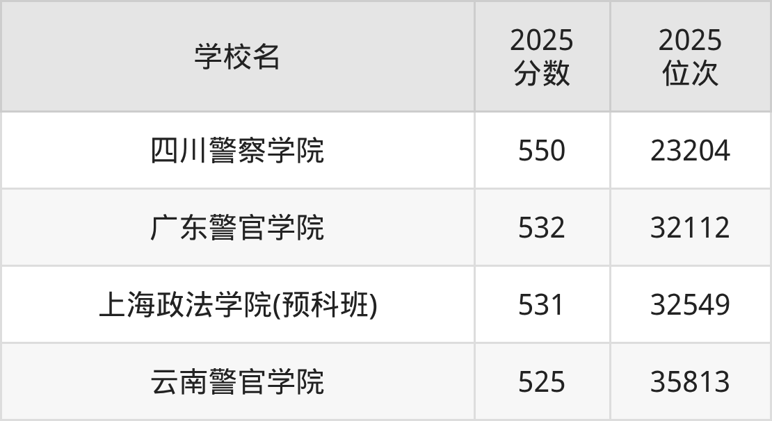 物理類520到550分的大學中分數(shù)對應位次最高的是四川警察學院,2025年最低分550分,對應最低位次是23204名;分數(shù)對應位次最低的是云南警官學院,2025年最低分525分,對應最低位次是35813名。