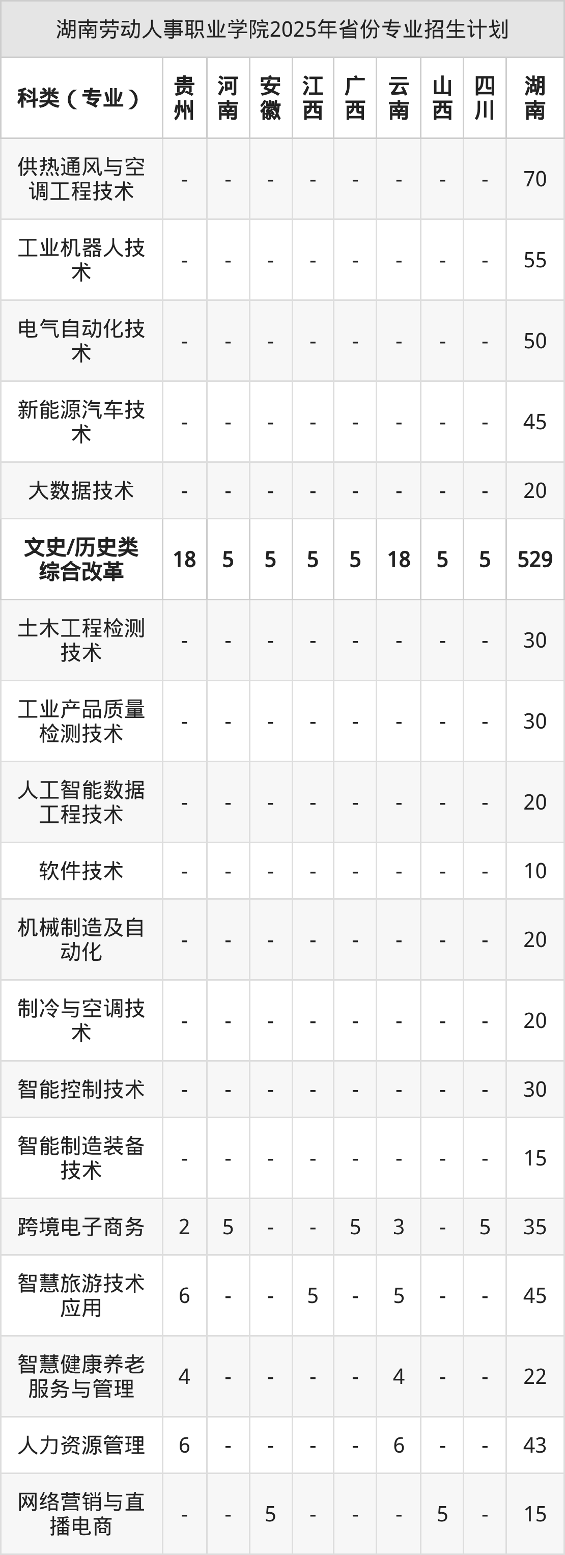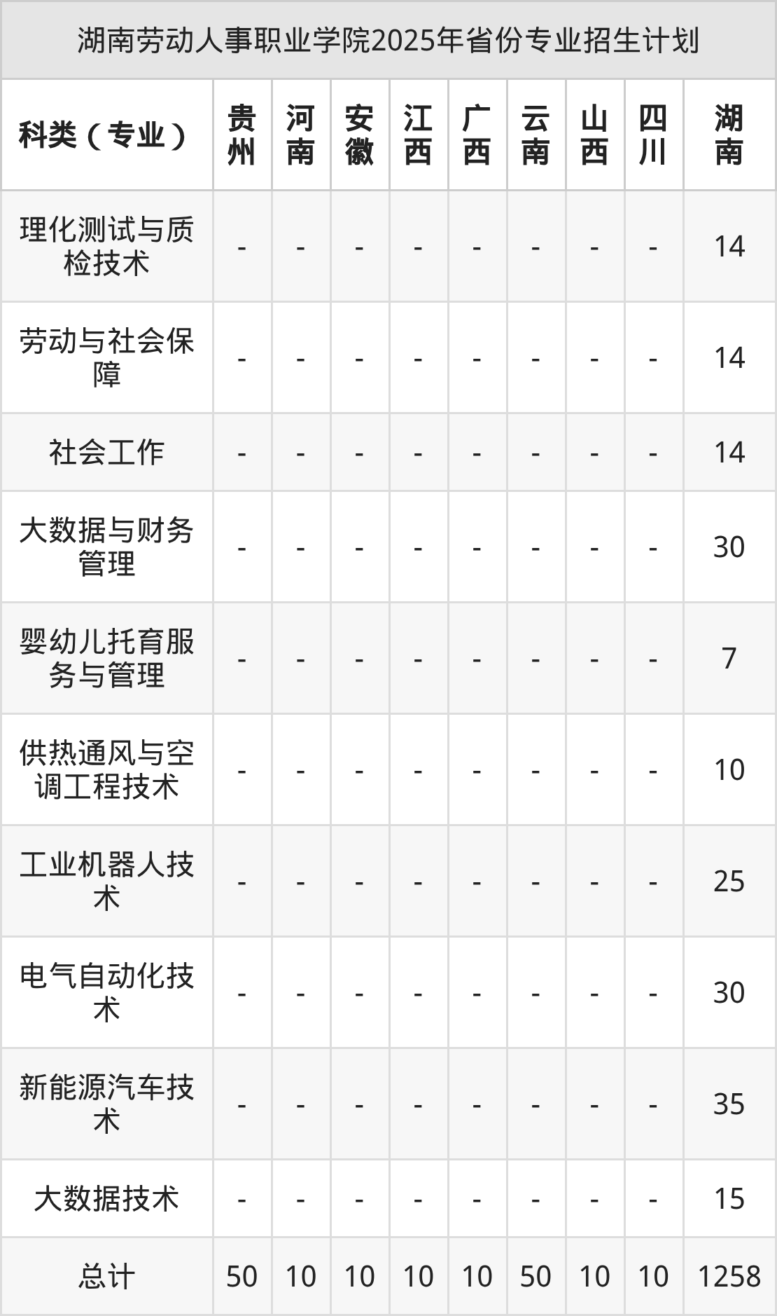 而各省份的招生計(jì)劃數(shù)為湖南1258人,江西10人,廣西10人,云南50人,山西10人等。