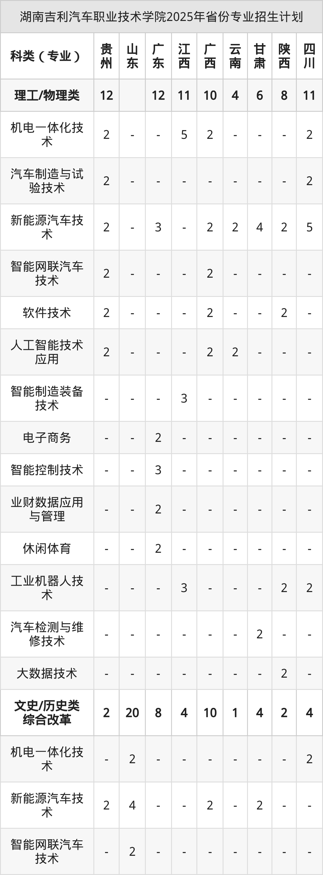 湖南吉利汽車職業(yè)技術(shù)學(xué)院2026年招生簡(jiǎn)章預(yù)計(jì)在6月發(fā)布,目前同學(xué)們可以先參考2025年招生簡(jiǎn)章。信息顯示,該校計(jì)劃面向13個(gè)地區(qū)招收??粕?176人,其中機(jī)電一體化技術(shù)專業(yè)63人,汽車制造與試驗(yàn)技術(shù)專業(yè)162人。