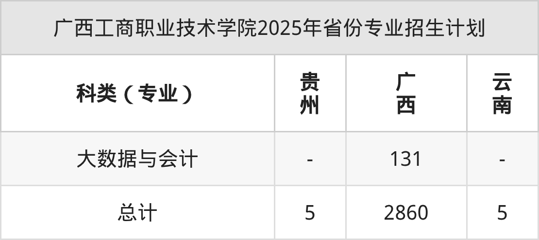 而各省份的招生計劃數(shù)為貴州5人,廣西2860人,云南5人。