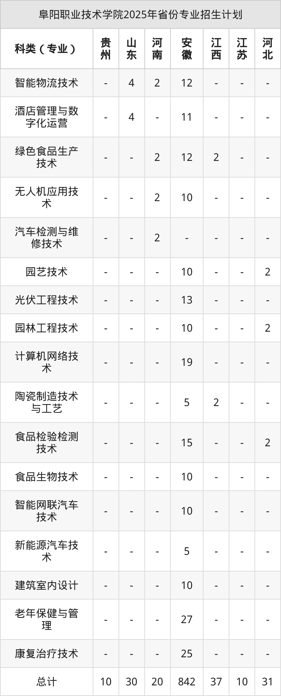 而各省份的招生計(jì)劃數(shù)為貴州10人,山東30人,河南20人,安徽842人,江西37人等。
