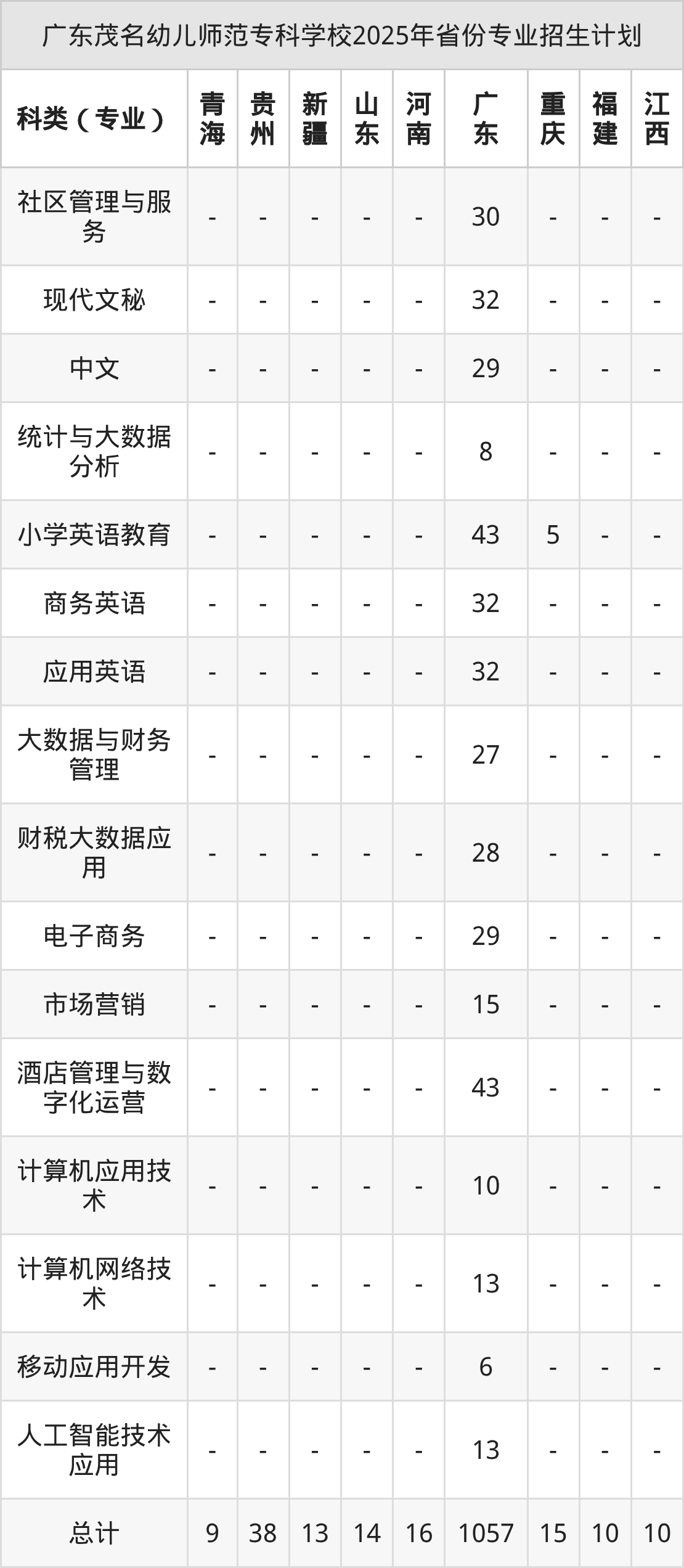 而各省份的招生計劃數(shù)為浙江5人,青海9人,山東14人,河南16人,廣東1057人等。