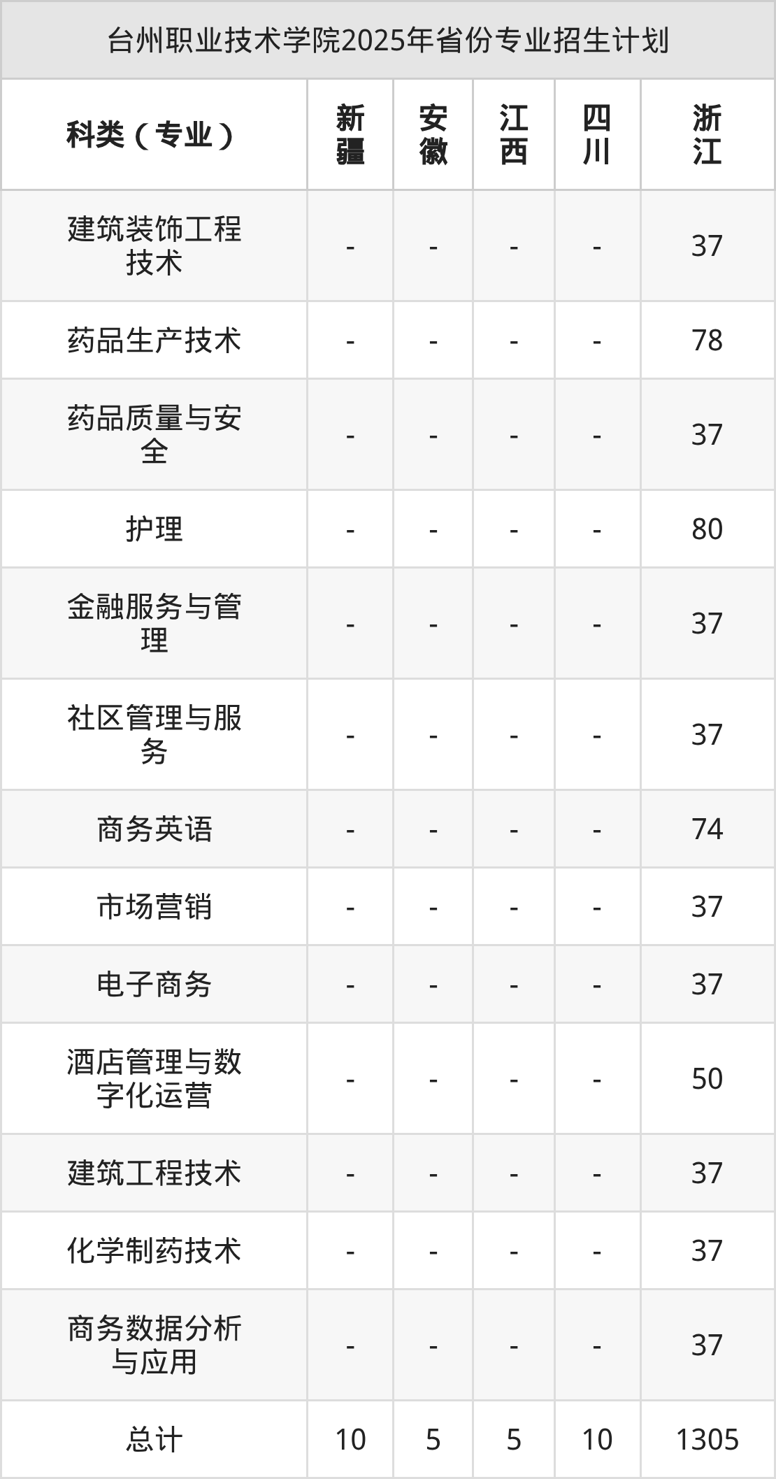 而各省份的招生計(jì)劃數(shù)為安徽5人,江西5人,四川10人,浙江1305人,新疆10人。