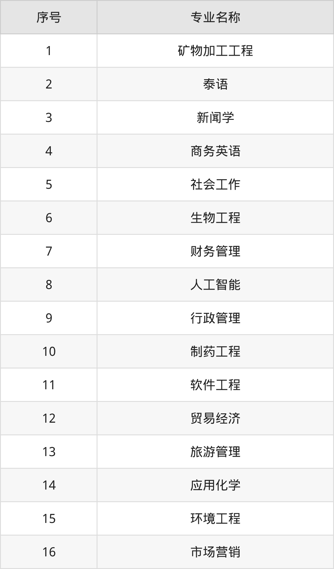物理類(理科)本科招生專業(yè):礦物加工工程、泰語、新聞學、人工智能、軟件工程、生物工程、環(huán)境工程、財務管理、社會工作、應用化學等。