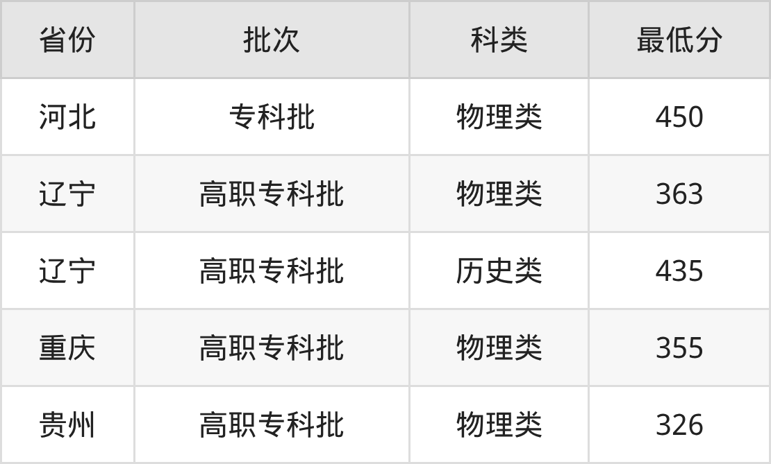 2025年大連職業(yè)技術(shù)學(xué)院汽車檢測(cè)與維修技術(shù)專業(yè)在遼寧省內(nèi)??普形锢眍惪忌蜌v史類考生,最低分為363分(物),超專科線213分,考生最低錄取位次為119453名。下面是專業(yè)分?jǐn)?shù)詳情: