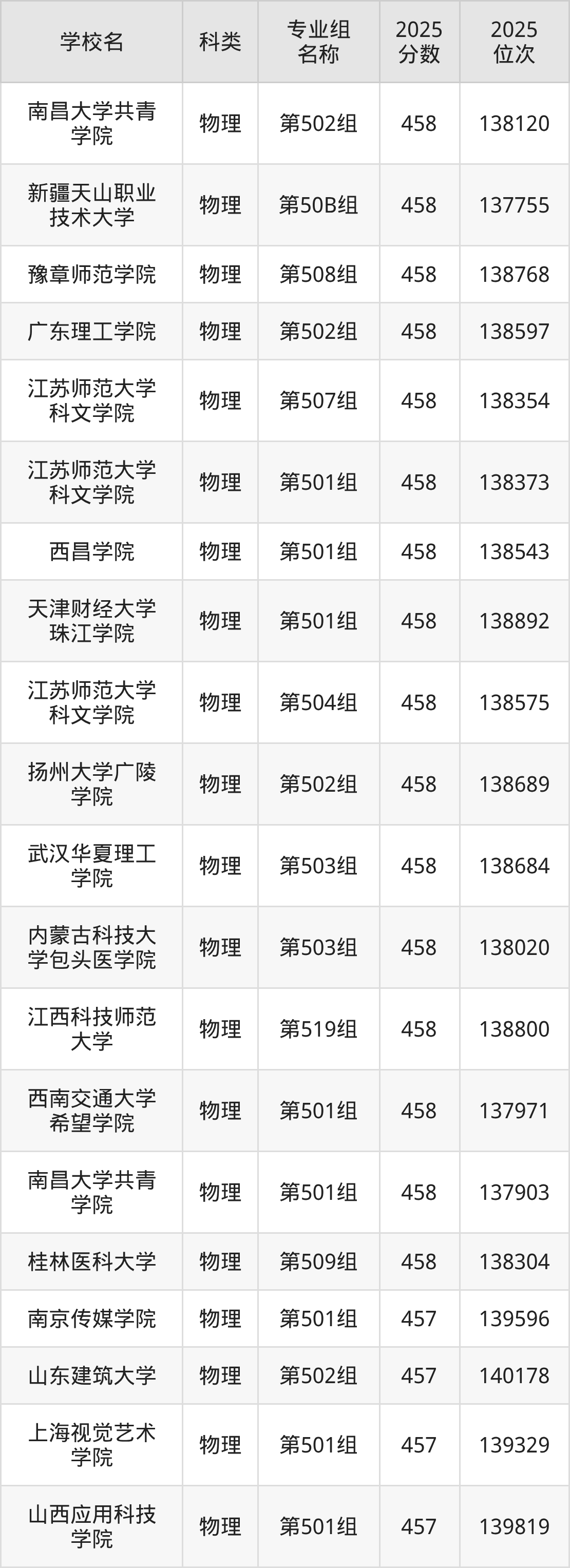 2025年江西物理類本科線為429分,458分能上的二本大學(xué)共計283所,其中公辦大學(xué)錄取位次排名最低的是西北師范大學(xué)(第501組429分),其2025最低位次為172066名。