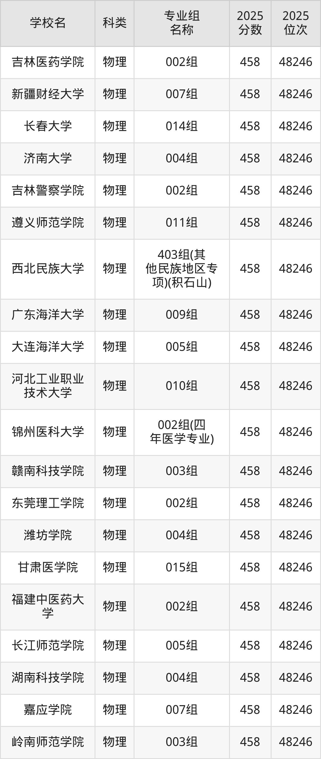 2025年甘肅物理類本科線為374分,458分能上的二本大學(xué)共計511所,其中公辦大學(xué)錄取位次排名最低的是南通大學(xué)(006組374分,位次93788名),即代表考生省排名位次在93788名及以內(nèi)就可以報考公辦本科。