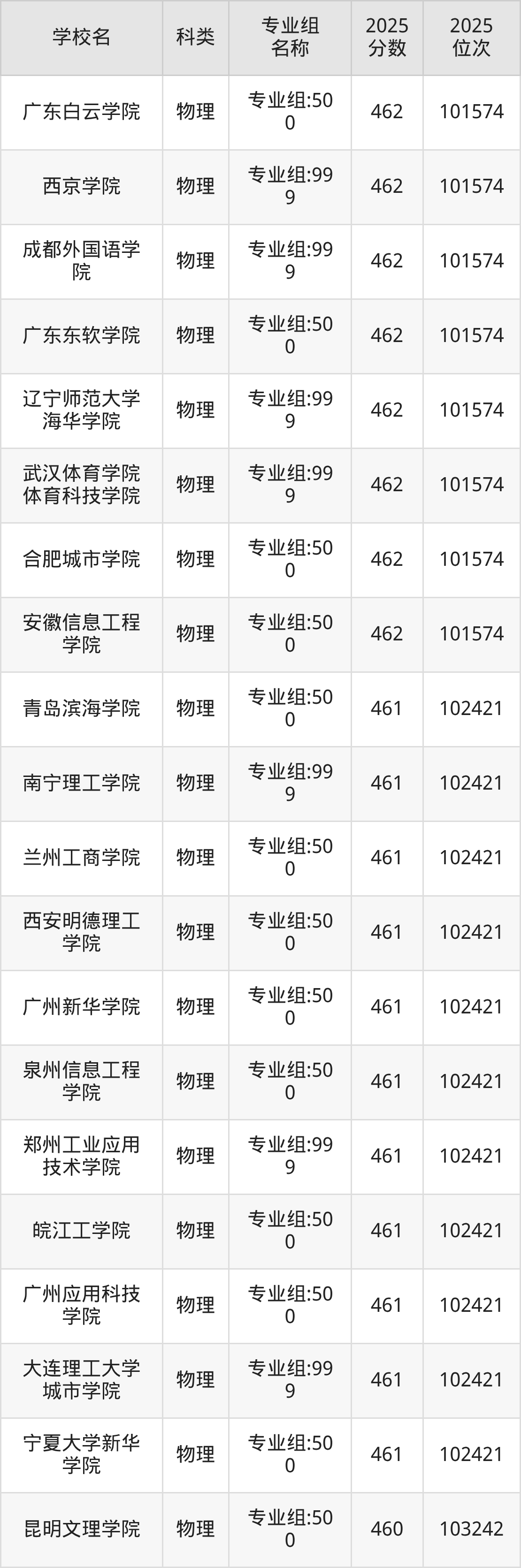 而位次最低的民辦院校有上海建橋?qū)W院(專業(yè)組:999)、西京學(xué)院(專業(yè)組:999)、江西科技學(xué)院(專業(yè)組:999)、浙江越秀外國語學(xué)院(專業(yè)組:999),分?jǐn)?shù)為450分,對應(yīng)最低位次排名為25562名。