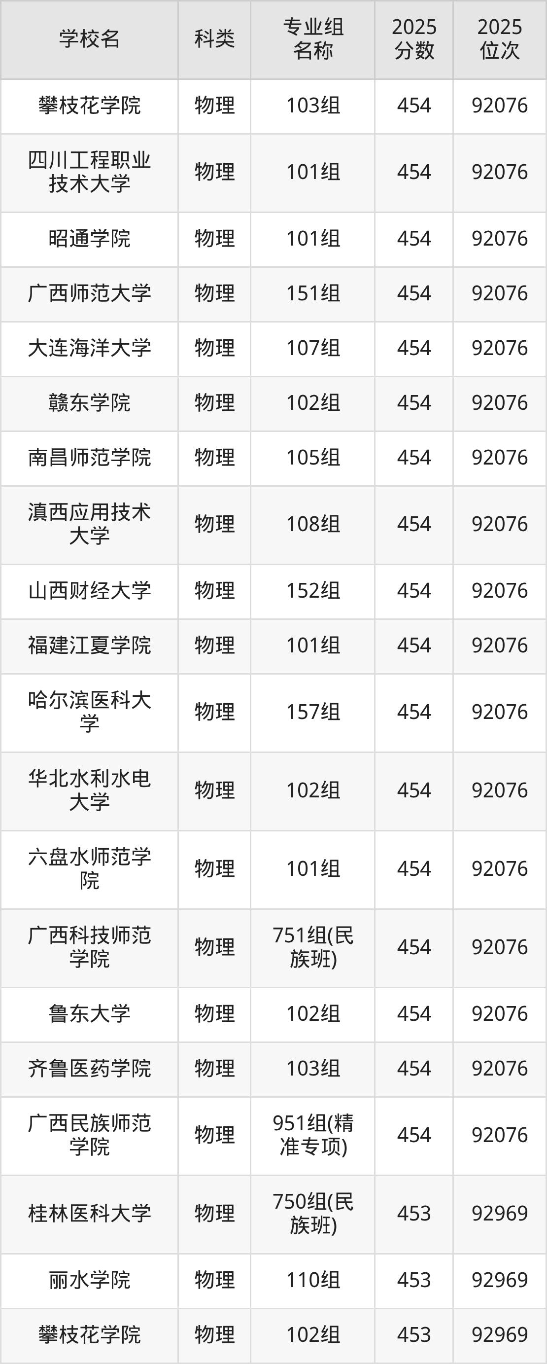 2025年廣西物理類本科線為370分,454分能上的二本大學(xué)共計588所,其中公辦大學(xué)錄取位次排名最低的是桂林醫(yī)科大學(xué)(951組370分),其2025最低位次為174425名。