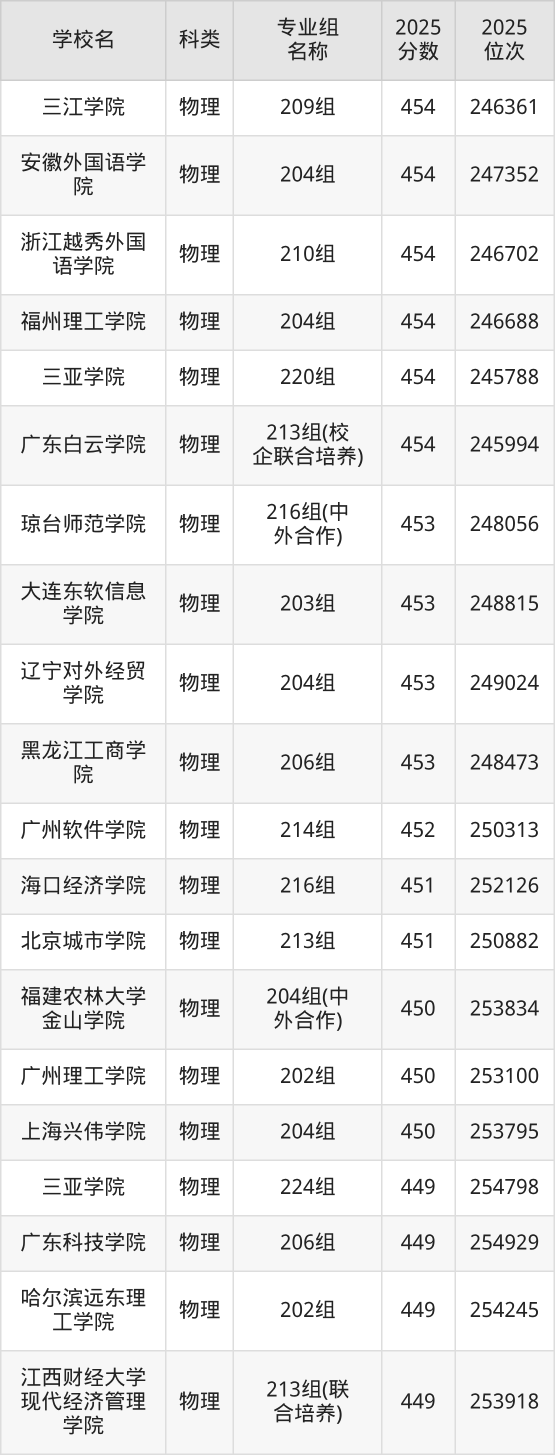 2025年廣東物理類本科線為436分,454分能上的二本大學(xué)共計48所,其中公辦大學(xué)錄取位次排名最低的是福建商學(xué)院(202組(預(yù)科班)440分,位次269323名),即代表考生省排名位次在269323名及以內(nèi)就可以報考公辦本科。