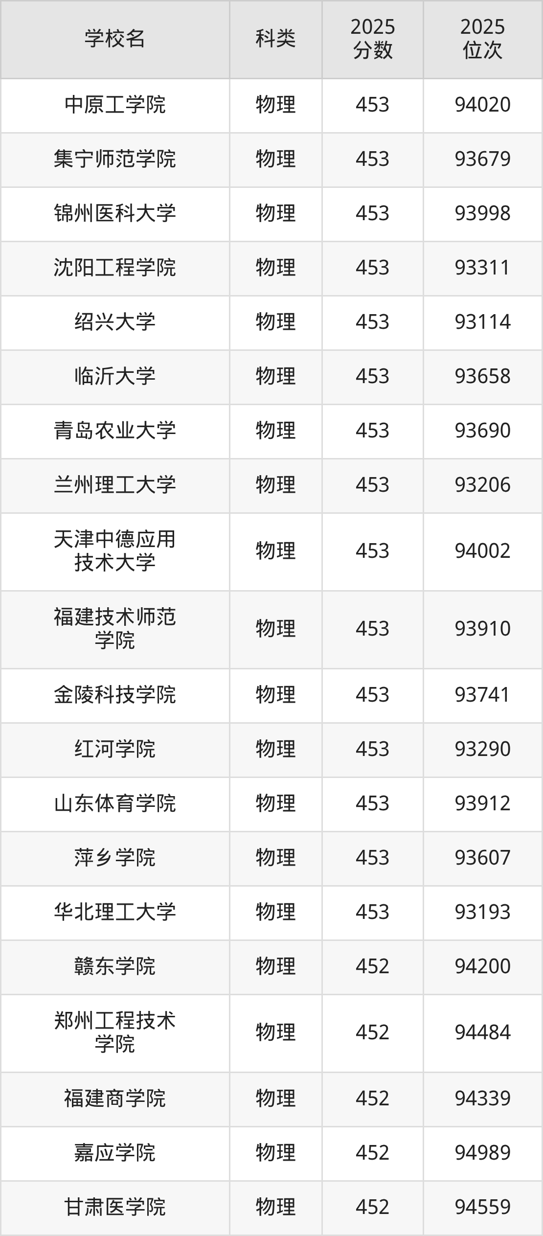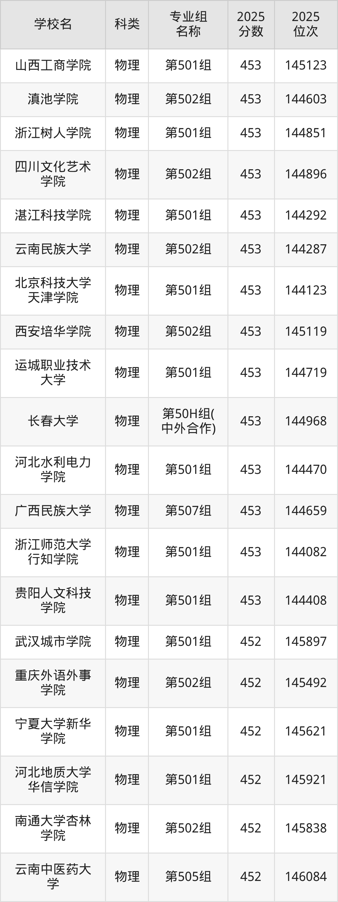 2025年江西物理類本科線為429分,453分能上的本科大學(xué)共計(jì)254所,其中公辦大學(xué)錄取位次排名最低的是瓊臺師范學(xué)院(第502組(中外合作)429分,位次172066名),即代表考生省排名位次在172066名及以內(nèi)就可以報(bào)考公辦本科。