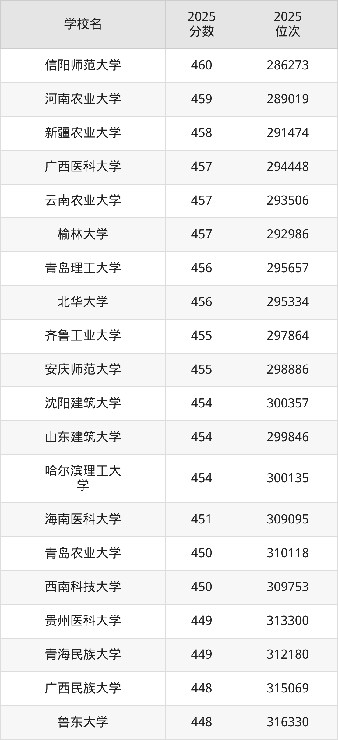 2025年山東一段線為441分,460分能上的一本大學共計31所,其中公辦大學錄取位次排名最低的是曲阜師范大學(441分,位次332492名),即代表考生省排名位次在332492名及以內(nèi)就可以報考公辦本科。