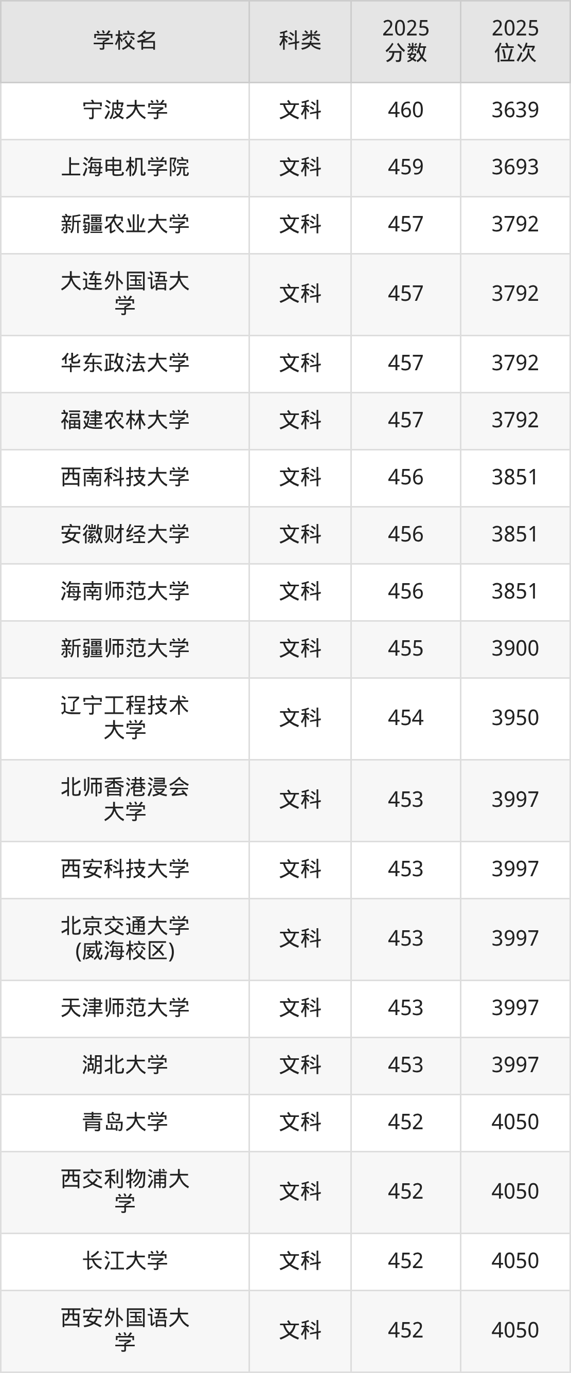 2025年新疆文科一本線為451分,460分能上的一本大學共計24所,其中最低分公辦院校為中南林業(yè)科技大學(451分),對應最低位次為4108名。因此想上公辦本科的考生維吾爾自治區(qū)排名位次至少要在4108名以內(nèi)。