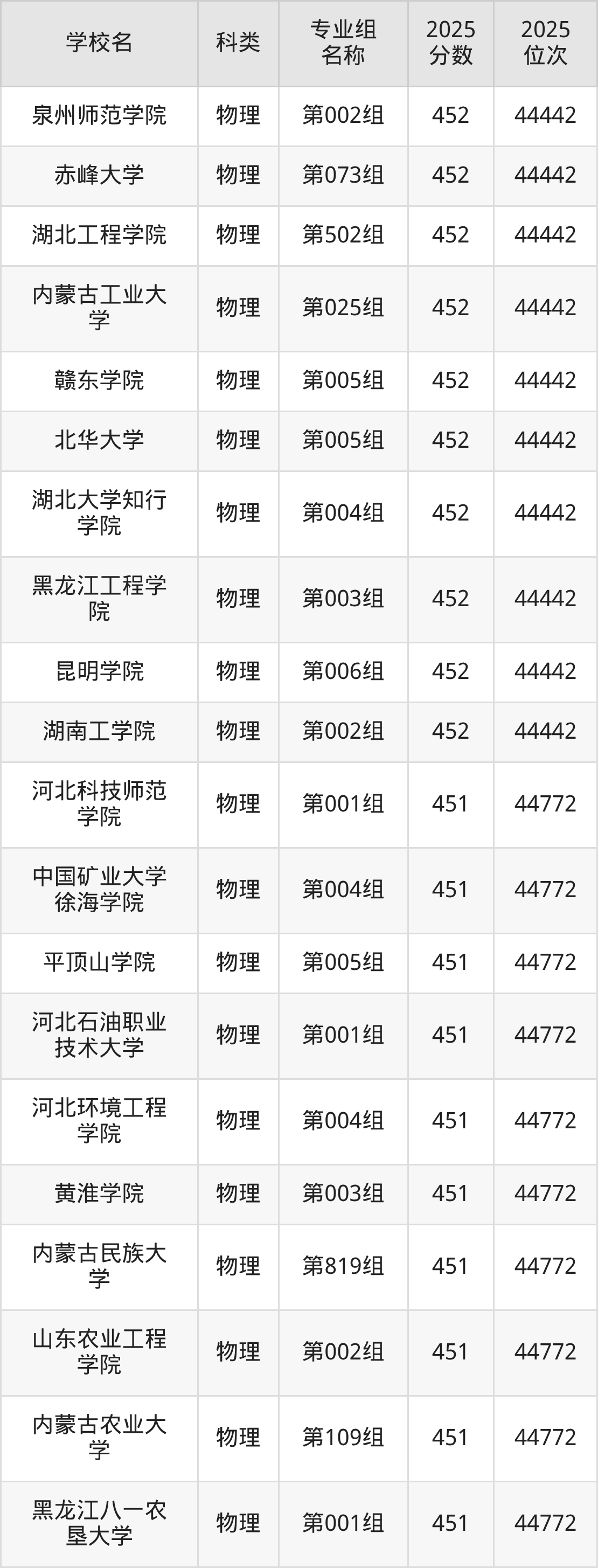 2025年內(nèi)蒙古物理類本科線為375分,452分能上的二本大學(xué)共計(jì)382所,其中公辦大學(xué)錄取位次排名最低的是內(nèi)蒙古醫(yī)科大學(xué)(第010組375分),其2025最低位次為68528名。