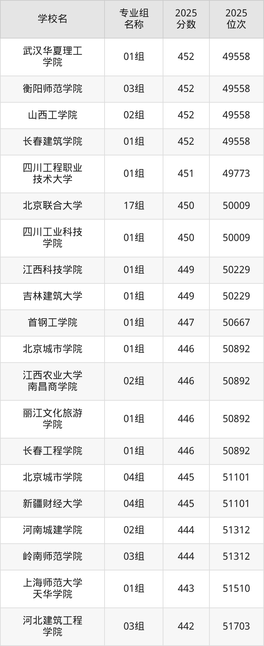 而民辦大學(xué)錄取位次排名最低的是內(nèi)蒙古鴻德文理學(xué)院(375分),其2025最低位次為68528名。