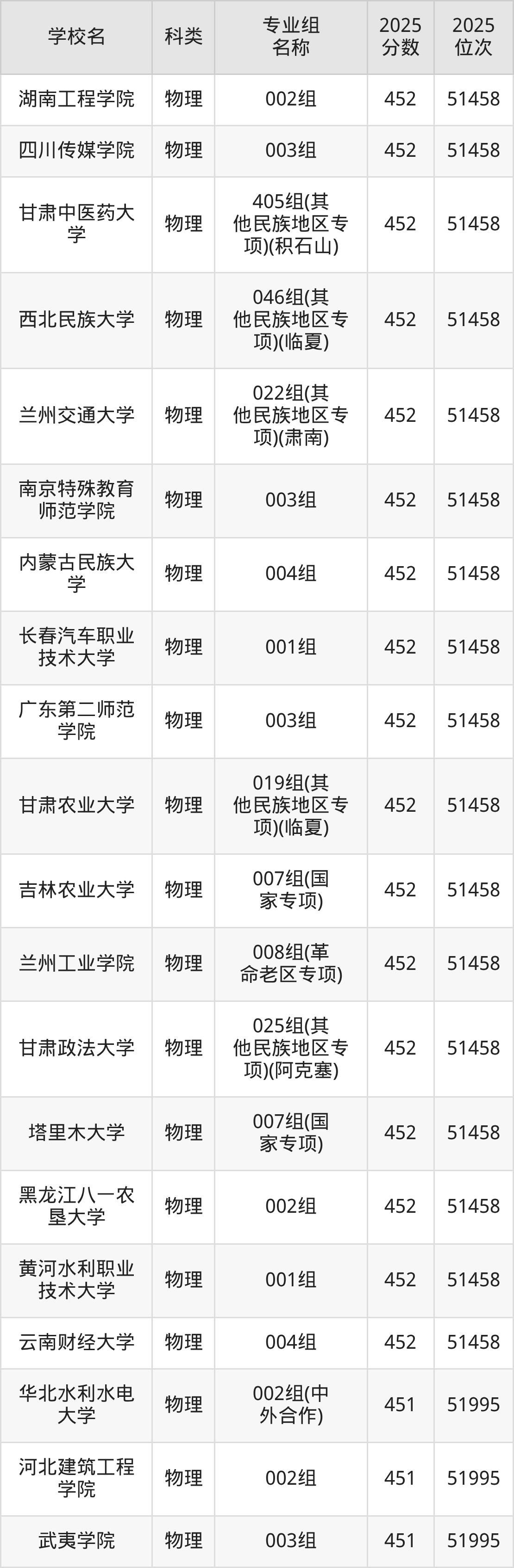 2025年甘肅物理類本科線為374分,452分能上的二本大學(xué)共計(jì)471所,其中最低分公辦院校為南通大學(xué)(006組374分),對(duì)應(yīng)最低位次為93788名。因此想上公辦本科的考生省排名位次至少要在93788名以內(nèi)。