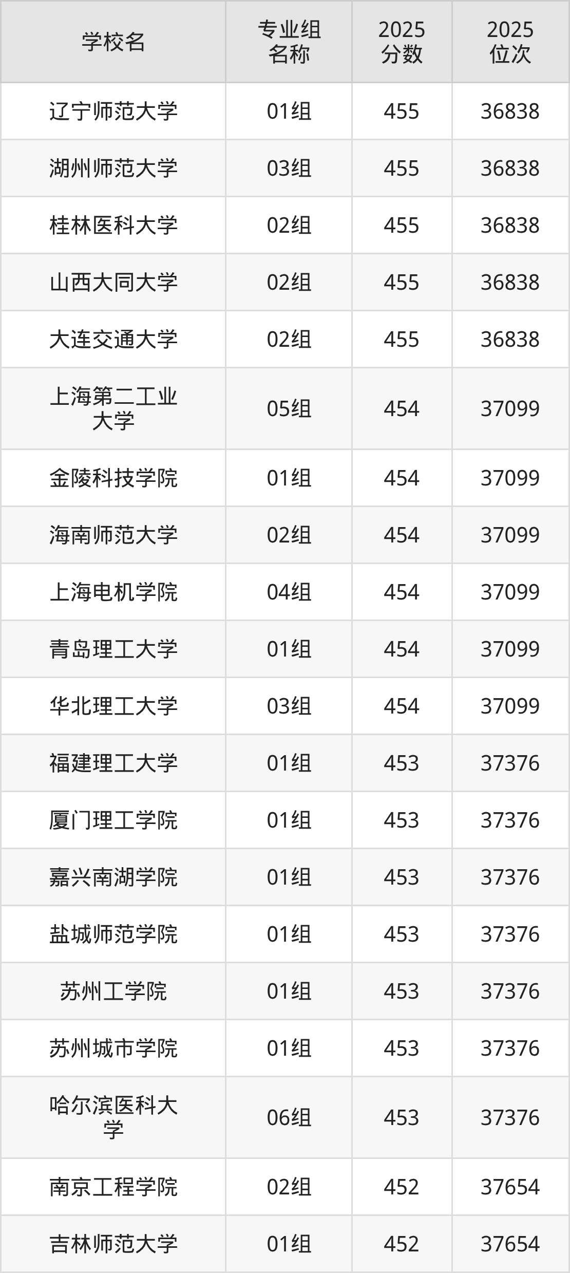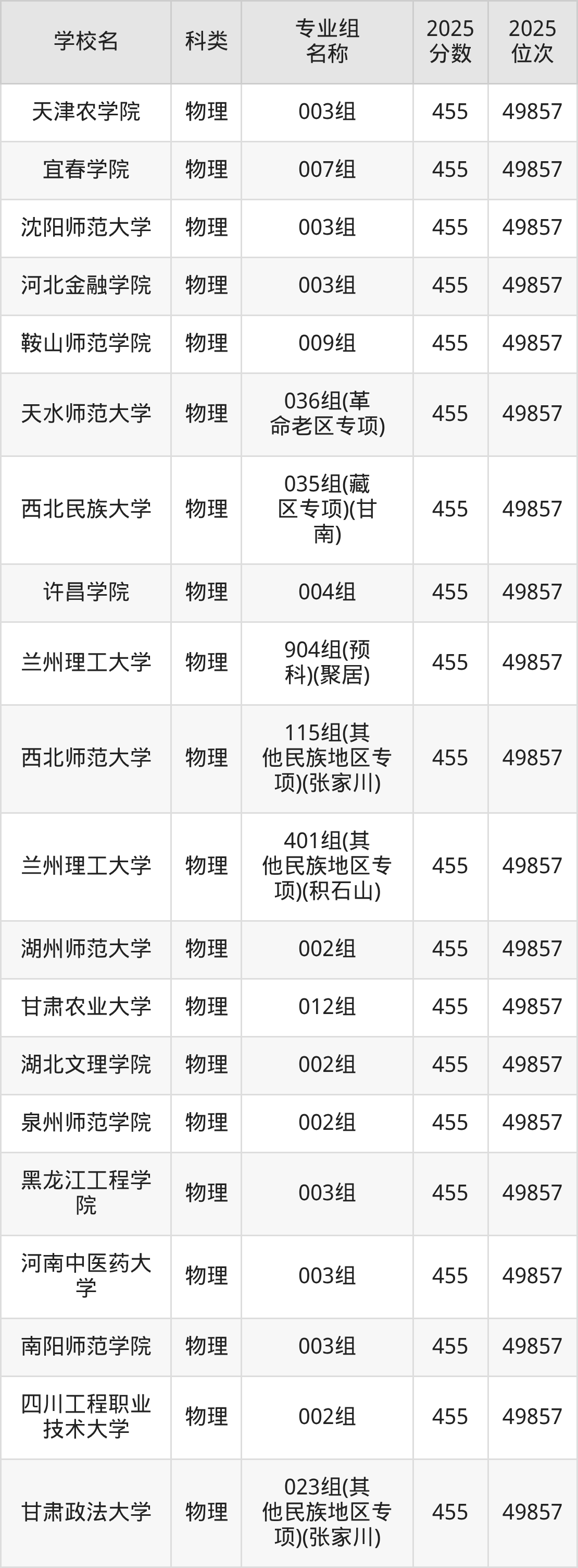 2025年甘肅物理類本科線為374分,455分能上的二本大學(xué)共計495所,其中公辦大學(xué)錄取位次排名最低的是南通大學(xué)(006組374分,位次93788名),即代表考生省排名位次在93788名及以內(nèi)就可以報考公辦本科。