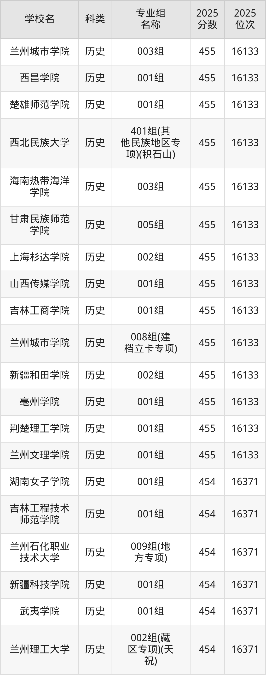 2025年甘肅歷史類本科線為412分,455分能上的二本大學(xué)共計306所,其中公辦大學(xué)錄取位次排名最低的是隴南師范學(xué)院(004組(藏區(qū)專項)(少數(shù)民族)(甘南)412分,位次25282名),即代表考生省排名位次在25282名及以內(nèi)就可以報考公辦本科。