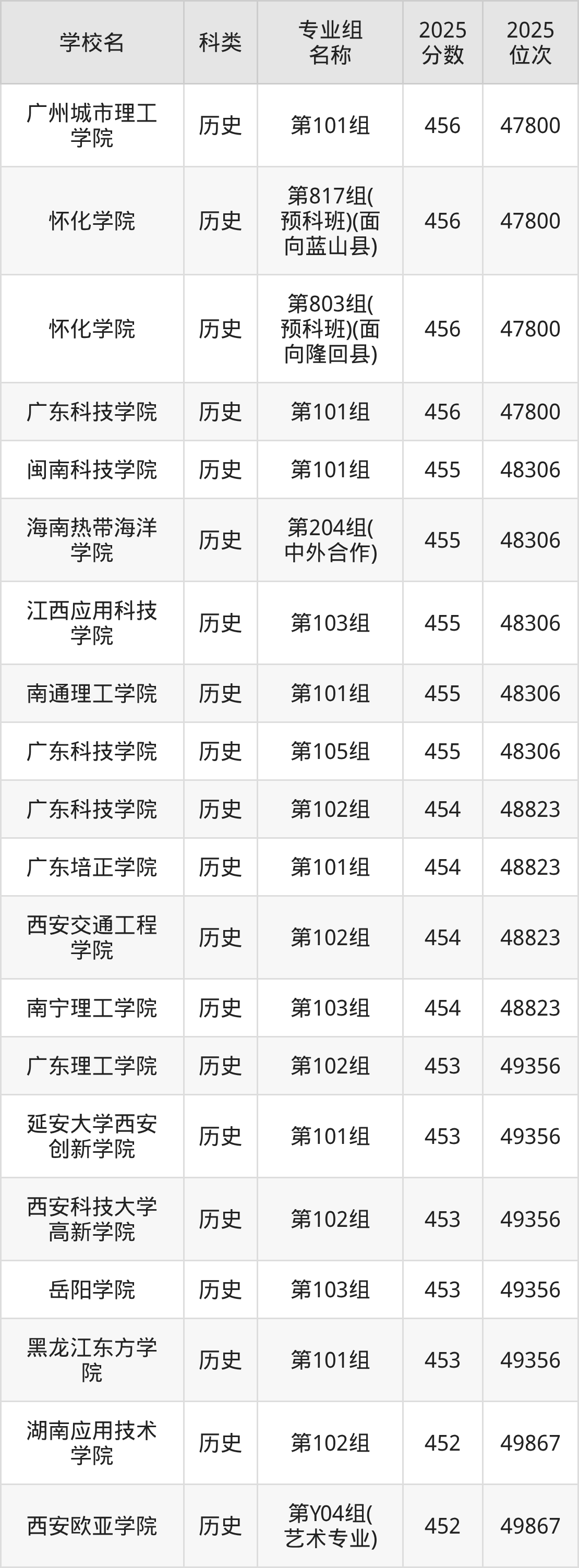 2025年湖南歷史類本科線為446分,456分能上的二本大學(xué)共計(jì)37所,其中公辦大學(xué)錄取位次排名最低的是桂林旅游學(xué)院(第206組(中外合作)446分),其2025最低位次為53081名。