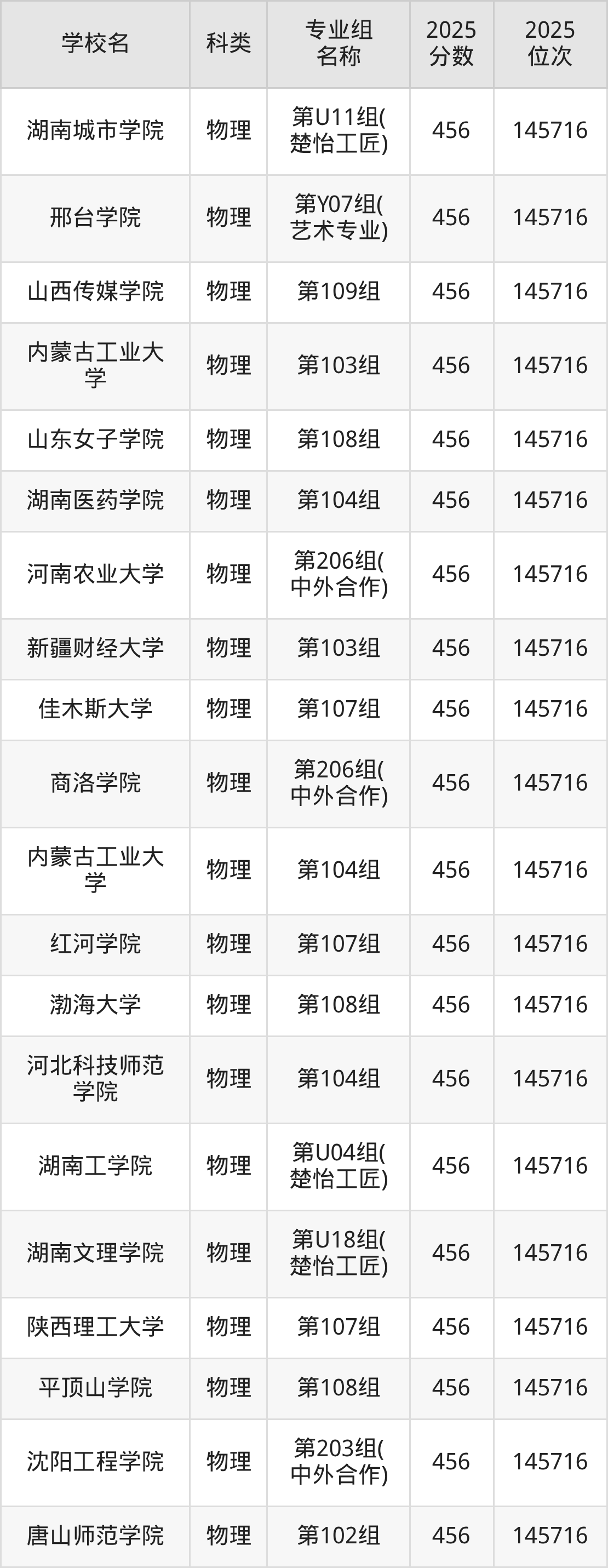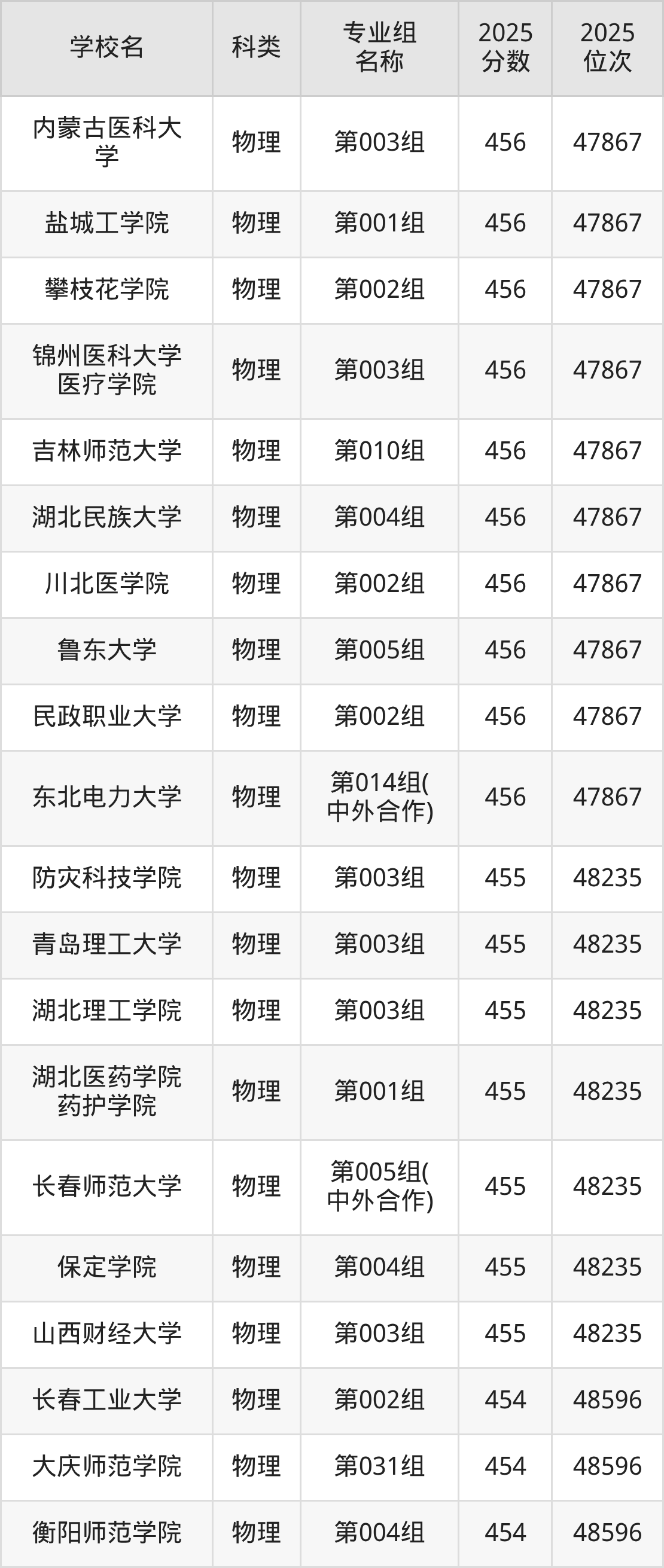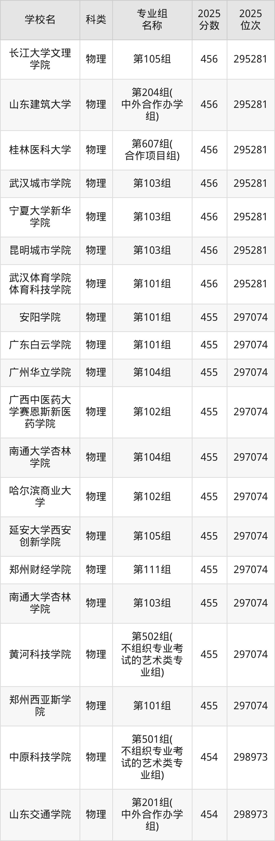 2025年湖南物理類本科線為405分,456分能上的二本大學(xué)共計(jì)460所,其中公辦大學(xué)錄取位次排名最低的是桂林醫(yī)科大學(xué)(第215組(中外合作)406分),其2025最低位次為210303名。