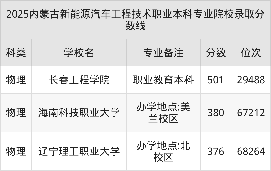 2025年內(nèi)蒙古新能源汽車工程技術(shù)職業(yè)本科專業(yè)招生院校有3所,分?jǐn)?shù)最低的是遼寧理工職業(yè)大學(xué)(376分、物理類位次68264名),分?jǐn)?shù)最高的是長(zhǎng)春工程學(xué)院(501分、物理類位次29488名)。