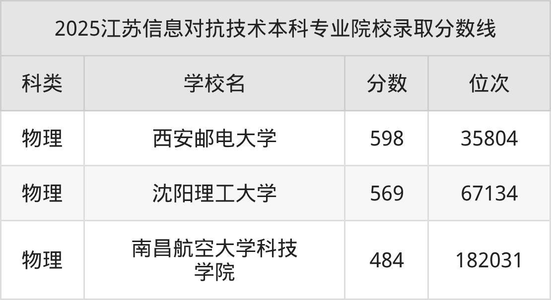 2025年江蘇信息對(duì)抗技術(shù)本科專業(yè)招生院校有3所,分?jǐn)?shù)最低的是南昌航空大學(xué)科技學(xué)院(484分、物理類位次182031名),分?jǐn)?shù)最高的是西安郵電大學(xué)(598分、物理類位次35804名)。