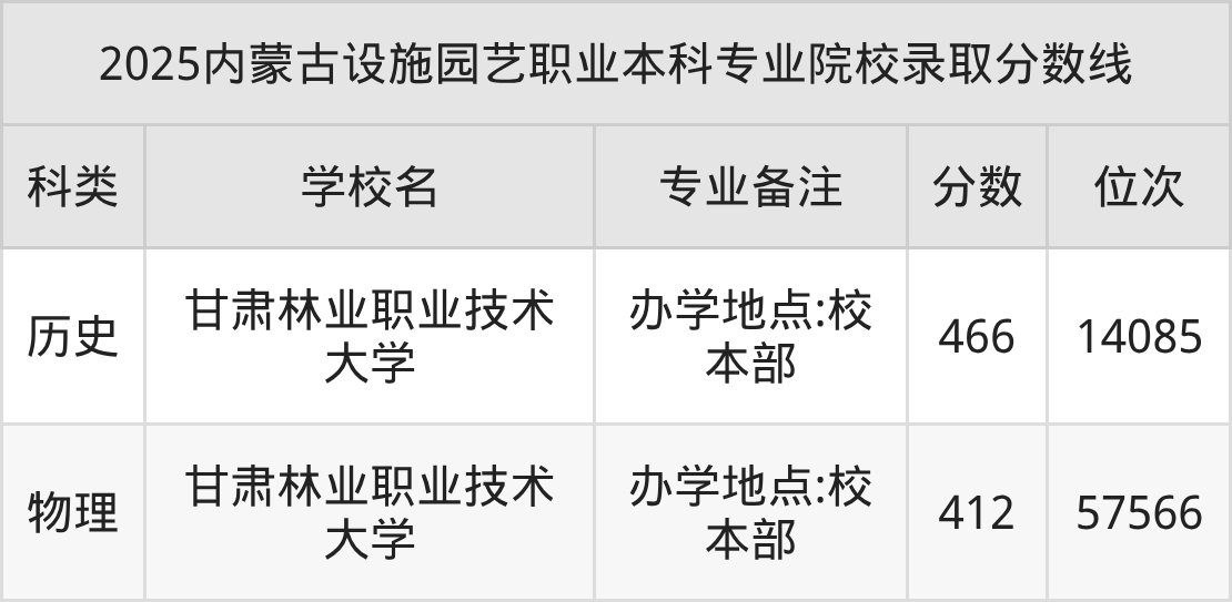 2025年內(nèi)蒙古設(shè)施園藝職業(yè)本科專業(yè)招生院校只有1所,即甘肅林業(yè)職業(yè)技術(shù)大學(xué),2025年該校設(shè)施園藝專業(yè)在內(nèi)蒙古的最低錄取分?jǐn)?shù)線為412分,最低錄取位次在57566名及以內(nèi)(物理類)。