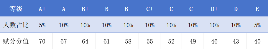 2、賦分規(guī)則:每個等級對應(yīng)固定分?jǐn)?shù),A+為70分,A為67分,B+為64分,依此類推至E等級40分,相鄰等級分差均為3分;
