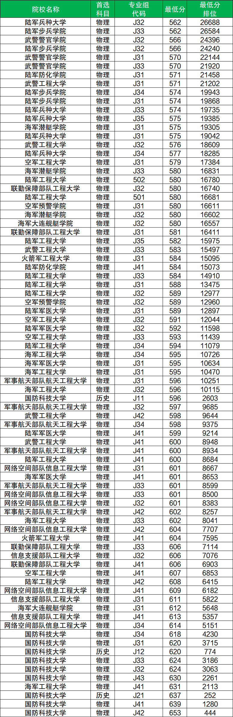 其中物理類分數(shù)至少在562分及以上、歷史類分數(shù)至少在596分及以上才有機會被錄取。而物理類分數(shù)最低的院校是陸軍兵種大學(第J32組)、陸軍步兵學院(第J33組),歷史類分數(shù)最低的院校是國防科技大學(第J11組)。下面是各校最低分詳情