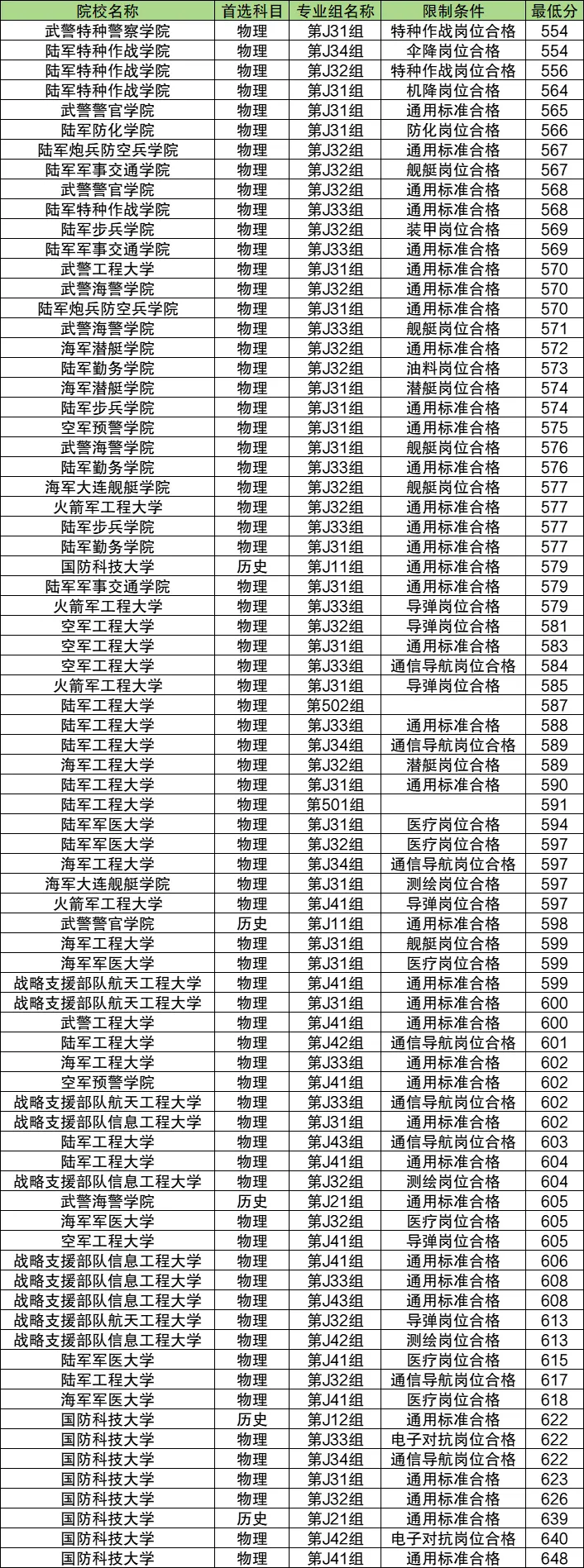 其中歷史類分數(shù)至少在579分及以上、物理類分數(shù)至少在554分及以上才有機會被錄取。而歷史類分數(shù)最低的院校是國防科技大學(第J11組),物理類分數(shù)最低的院校是武警特種警察學院(第J31組)。下面是各校最低分詳情: