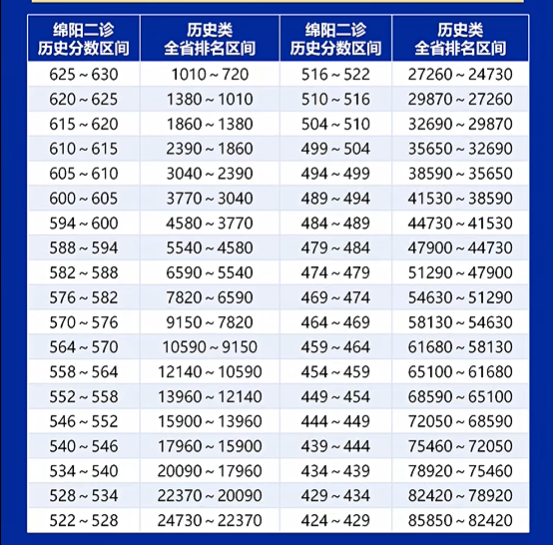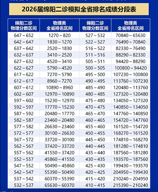 目前2026屆綿陽二診僅公布五分一段表,其中:物理類647分-652分對(duì)應(yīng)全省排名區(qū)間是1270名-820名,642分-647分對(duì)應(yīng)全省排名區(qū)間是1830名-1270名等。更多排名可見下表。