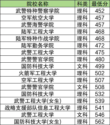 其中理科分?jǐn)?shù)至少在452分及以上、文科分?jǐn)?shù)至少在499分及以上才有機(jī)會(huì)被錄取。而理科分?jǐn)?shù)最低的院校是武警特種警察學(xué)院,文科分?jǐn)?shù)最低的院校是國(guó)防科技大學(xué)。下面是各校最低分詳情:
