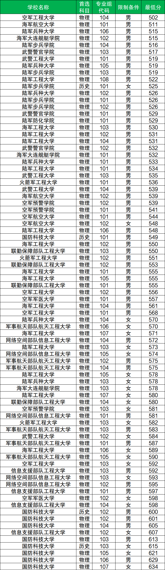 歷史類男生分數(shù)至少在549分及以上、女生分數(shù)至少在525分及以上才有機會參與軍檢進而過關(guān)被投檔。而男生分數(shù)最低的院校是國防科技大學(xué)(專業(yè)組代碼:101),女生分數(shù)最低的院校是陸軍步兵學(xué)院(專業(yè)組代碼:101)。