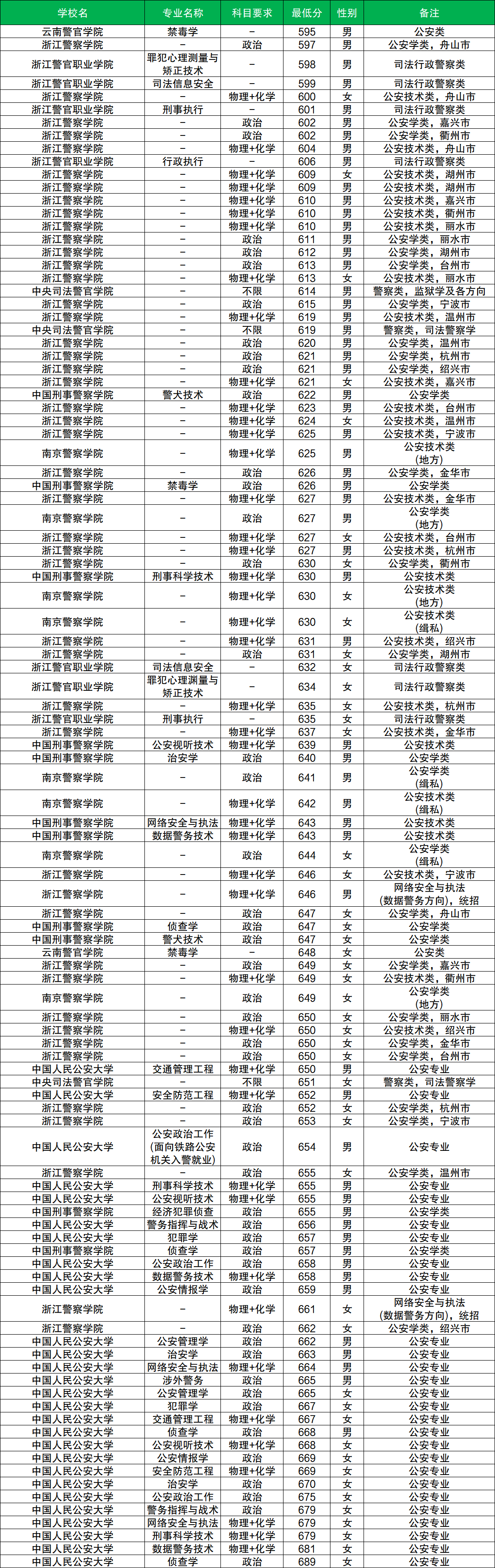 根據(jù)已有數(shù)據(jù),其中男生分?jǐn)?shù)至少在595分及以上、女生分?jǐn)?shù)至少在600分及以上才有機(jī)會(huì)被錄取。而男生分?jǐn)?shù)最低的院校是云南警官學(xué)院,女生分?jǐn)?shù)最低的院校是浙江警察學(xué)院。