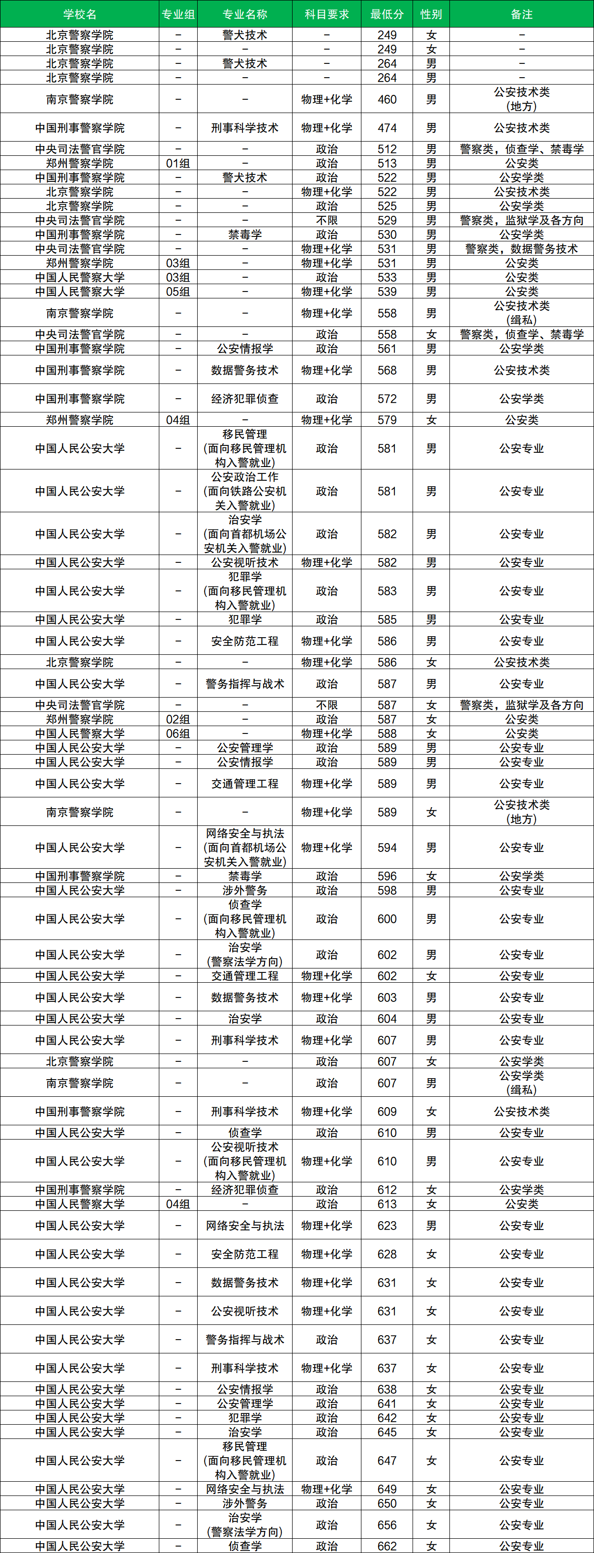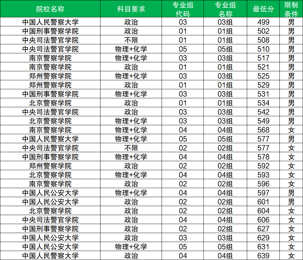根據(jù)已有數(shù)據(jù),其中男生分?jǐn)?shù)至少在499分及以上、女生分?jǐn)?shù)至少在568分及以上才有機(jī)會(huì)被錄取。而男生分?jǐn)?shù)最低的院校是中國人民警察大學(xué)(03組),女生分?jǐn)?shù)最低的院校是南京警察學(xué)院(04組)。