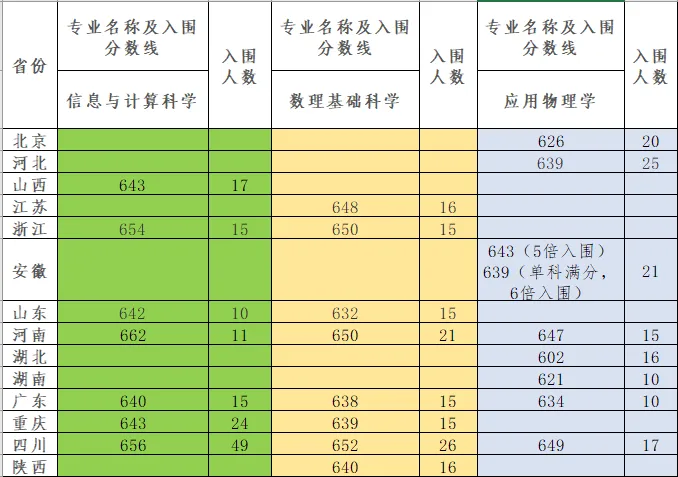 河南:信息與計算機科學專業(yè)入圍分數(shù)線為622分、數(shù)理基礎科學專業(yè)為650分、應用物理學為647分;
