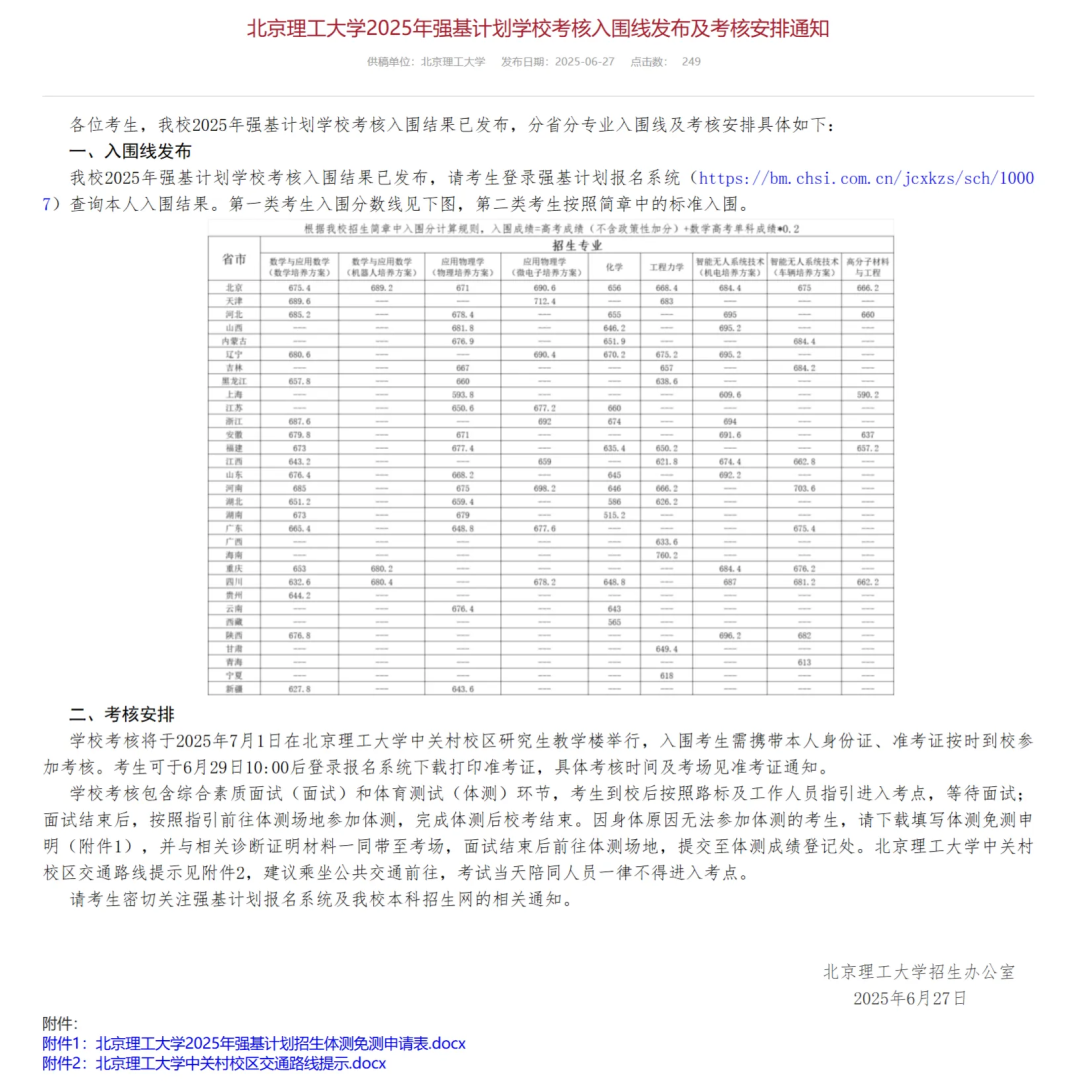 2025年與2024年強基計劃36所大學錄取分數(shù)線對于很多同學來說是比較想了解的,以北京理工大學為例,2025年該校強基計劃在北京的分數(shù)線為:數(shù)學與應用數(shù)學675.4分、應用物理學671分、化學656分等。