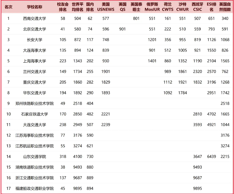 根據(jù)眾多世界大學(xué)排名榜,中國上榜的鐵道類高校中,綜合實力最強的是西南交通大學(xué),其9次上榜,世界平均排名為第504名,位居校友會中國鐵道類大學(xué)排名第一。
