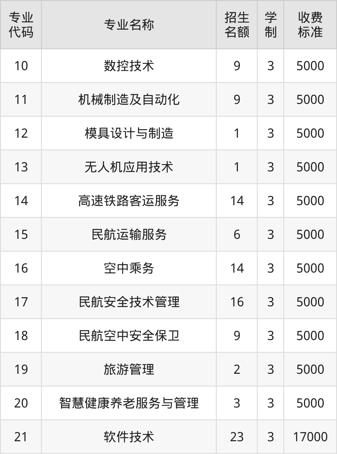 廊坊燕京職業(yè)技術學院無人機應用技術專業(yè)在??婆鷼v史類招1人,學制3年,專業(yè)招生代碼是01,學費是5000元一年。廊坊燕京職業(yè)技術學院高速鐵路客運服務專業(yè)在??婆鷼v史類招16人,學制3年,專業(yè)招生代碼是02,學費是5000元一年。