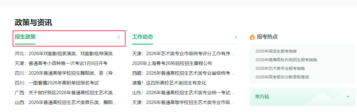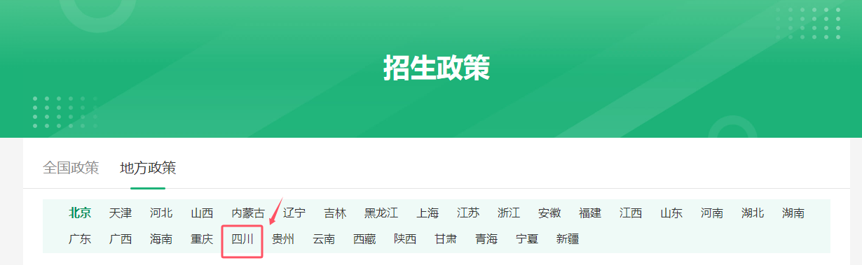 步驟一:在欄目下的【招生政策】中,選擇【地方政策】,可看到全國(guó)各省導(dǎo)航欄。