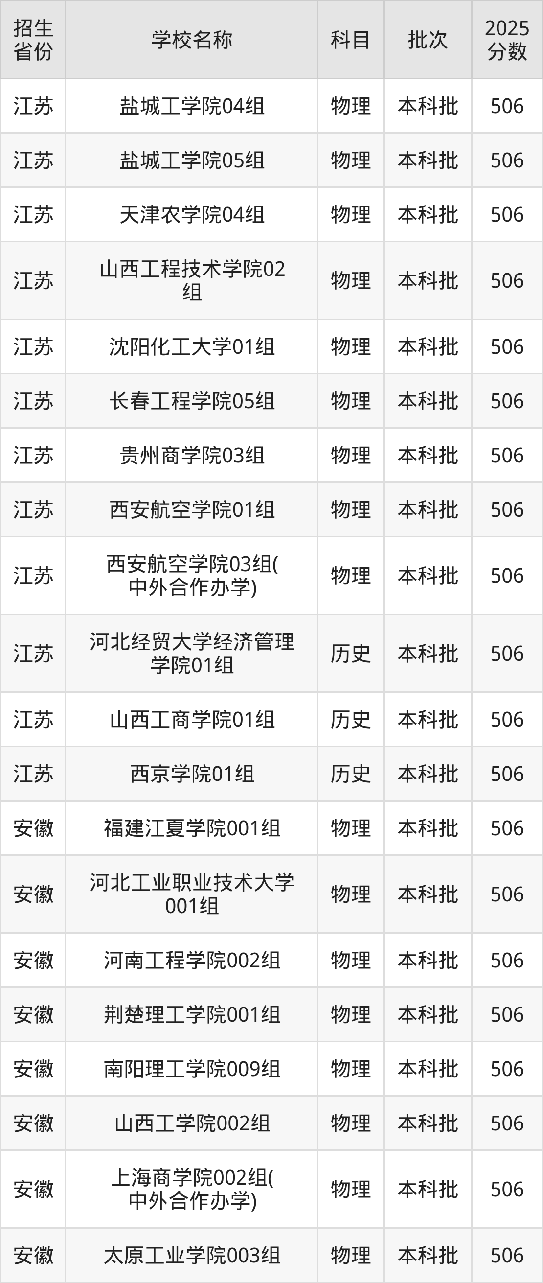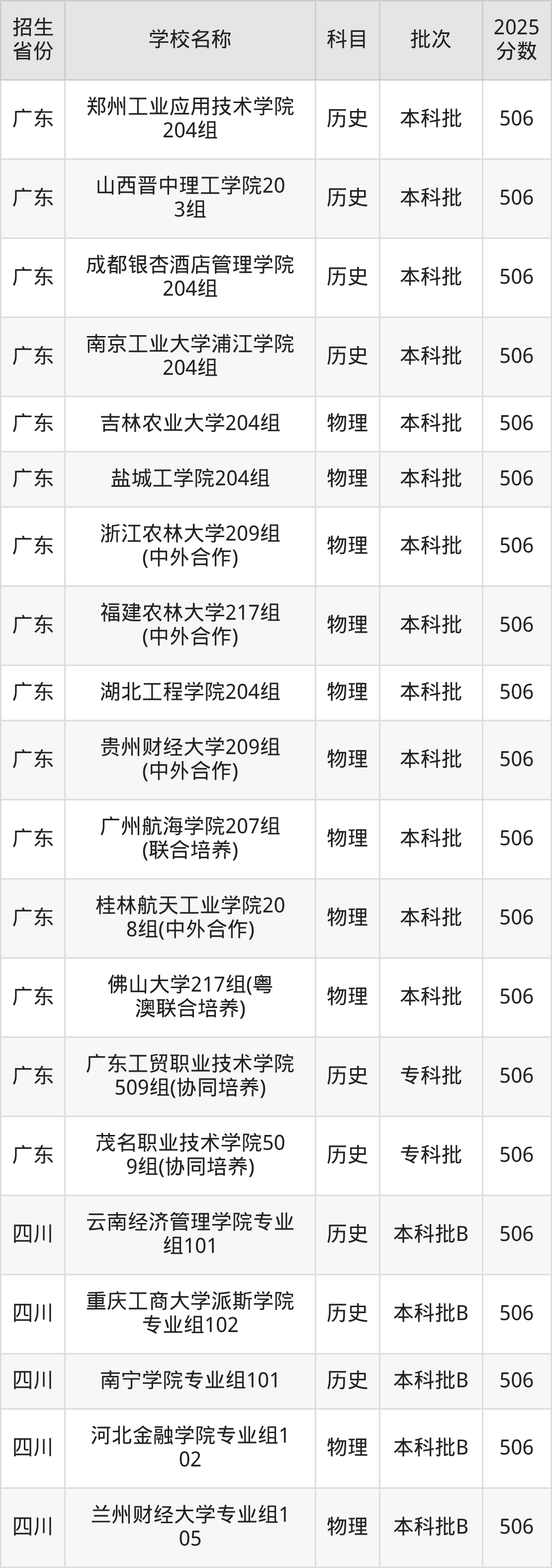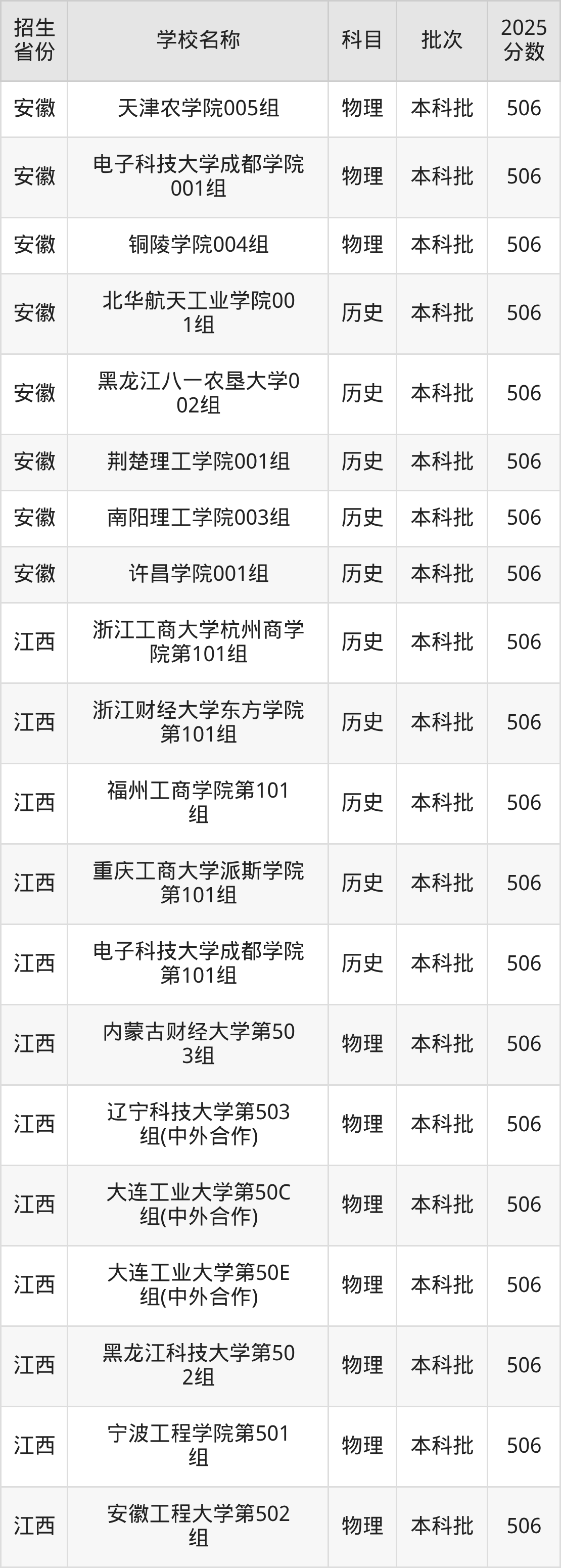 篩選全國各省2025年錄取分?jǐn)?shù)線為506分的理科大學(xué)如下: