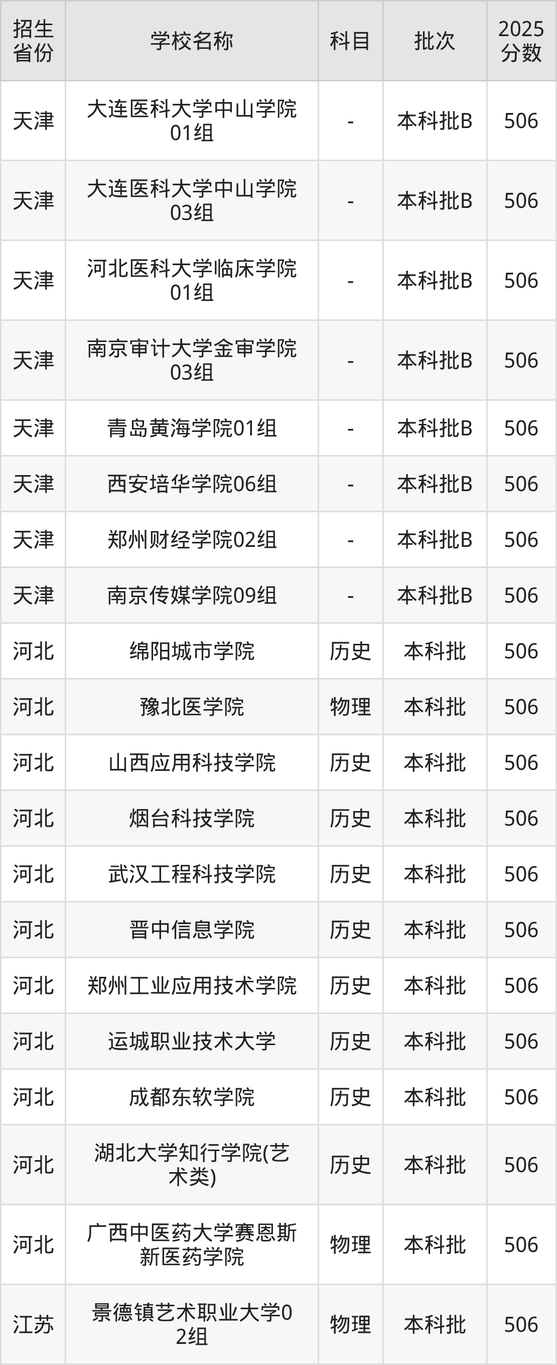 天津市分?jǐn)?shù)線是506分的二本民辦大學(xué)有:大連醫(yī)科大學(xué)中山學(xué)院、河北醫(yī)科大學(xué)臨床學(xué)院、南京審計(jì)大學(xué)金審學(xué)院、青島黃海學(xué)院、西安培華學(xué)院、鄭州財(cái)經(jīng)學(xué)院、南京傳媒學(xué)院。