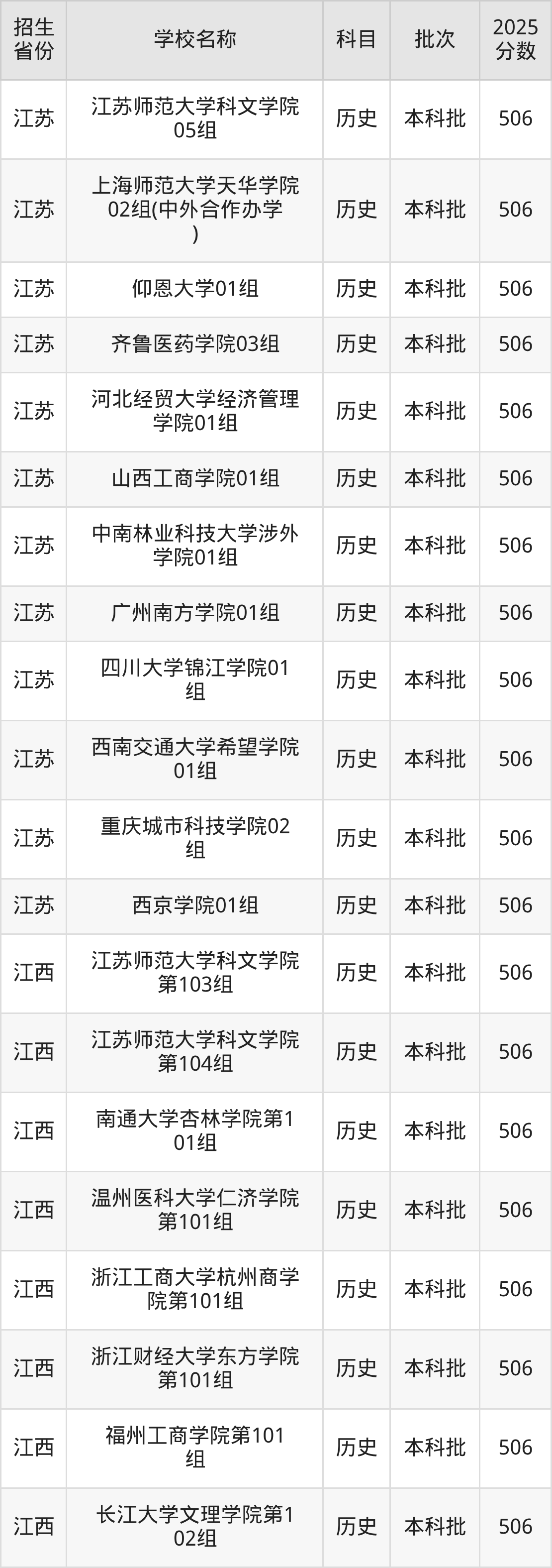 江蘇省歷史組分?jǐn)?shù)線是506分的二本民辦大學(xué)有:江蘇師范大學(xué)科文學(xué)院、上海師范大學(xué)天華學(xué)院、仰恩大學(xué)、齊魯醫(yī)藥學(xué)院、河北經(jīng)貿(mào)大學(xué)經(jīng)濟(jì)管理學(xué)院、山西工商學(xué)院、中南林業(yè)科技大學(xué)涉外學(xué)院、廣州南方學(xué)院、四川大學(xué)錦江學(xué)院、西南交通大學(xué)希望學(xué)院。